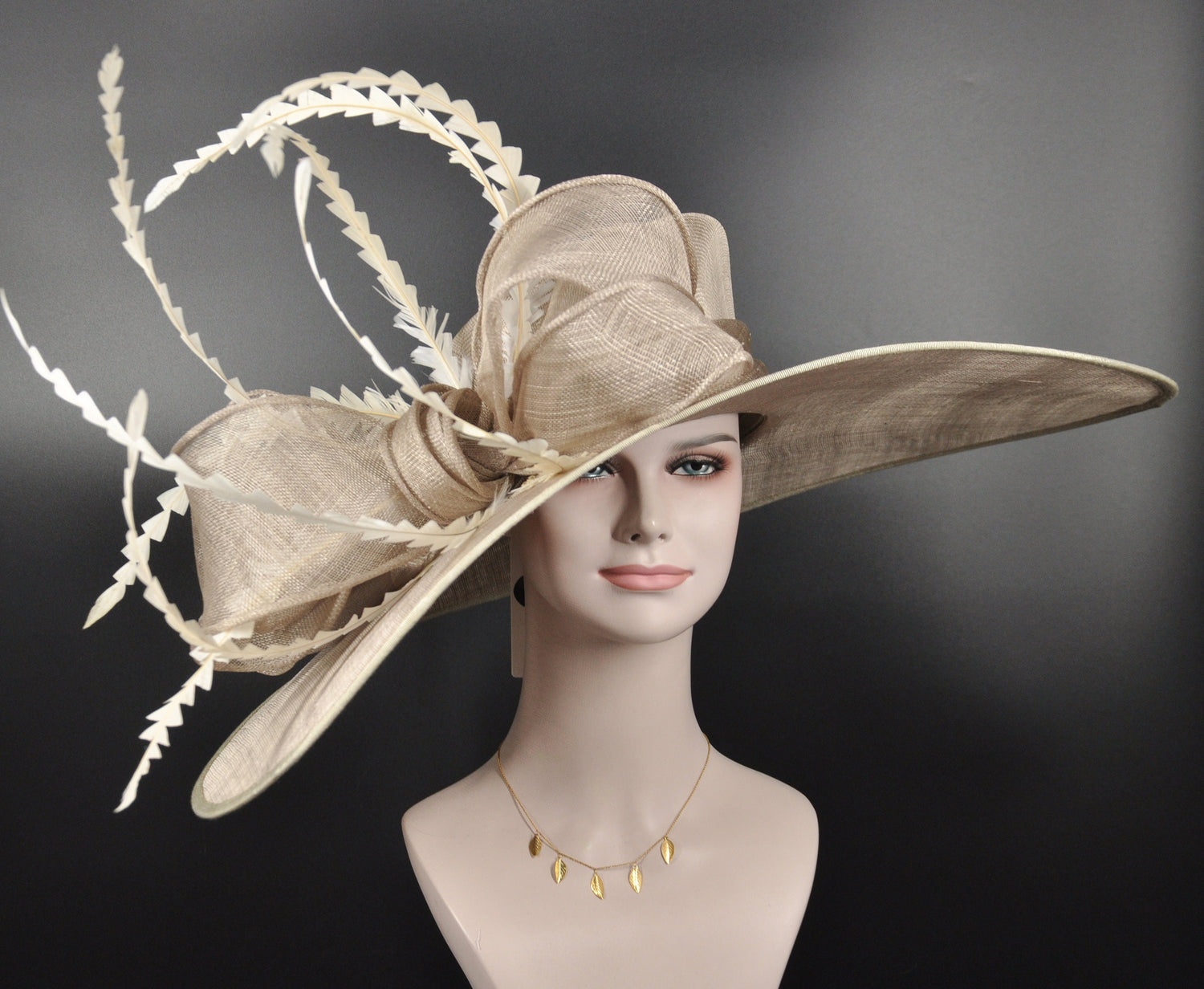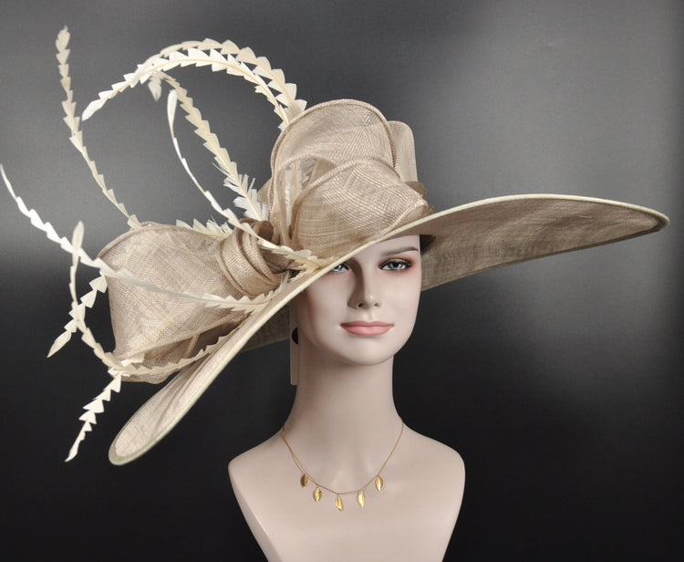 Taupe Kentucky Derby Hat: Wide Brim Sinamay Feather Ascot Hat
