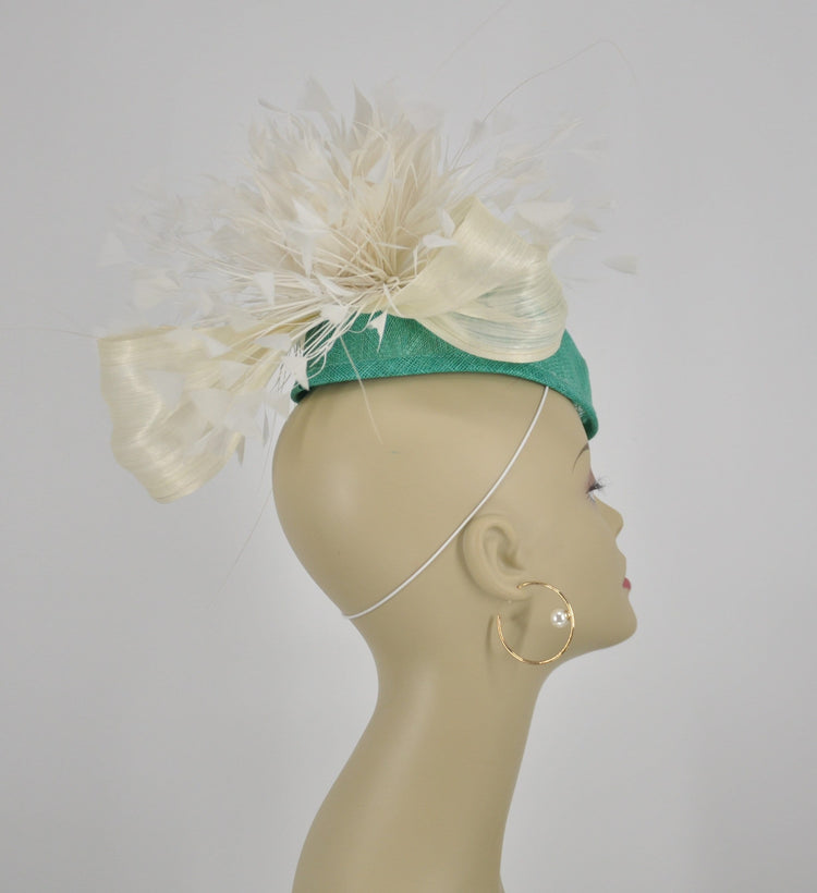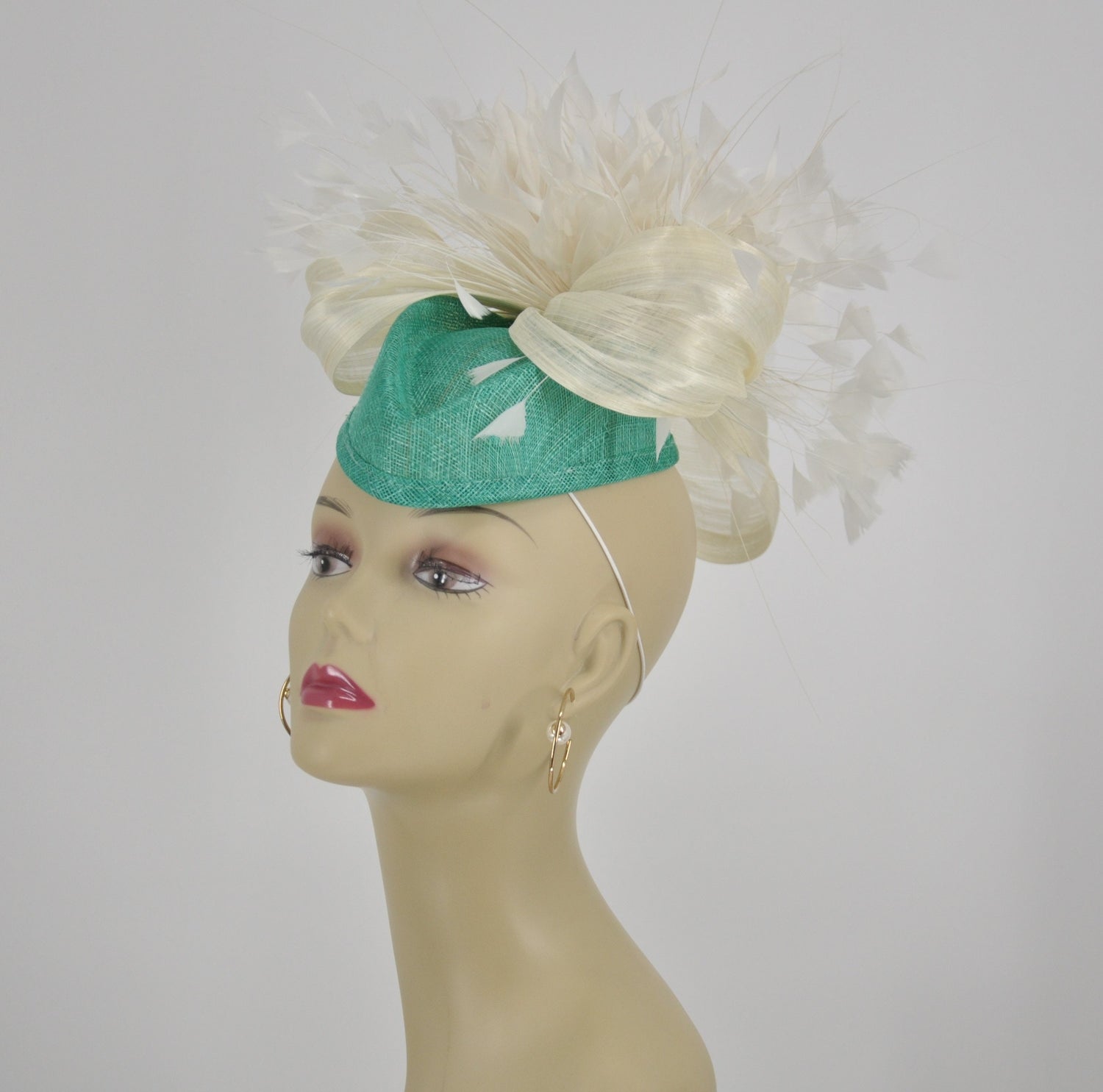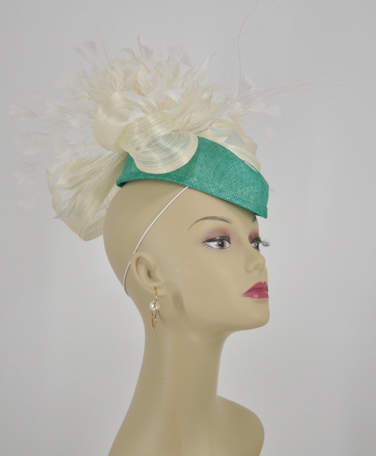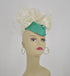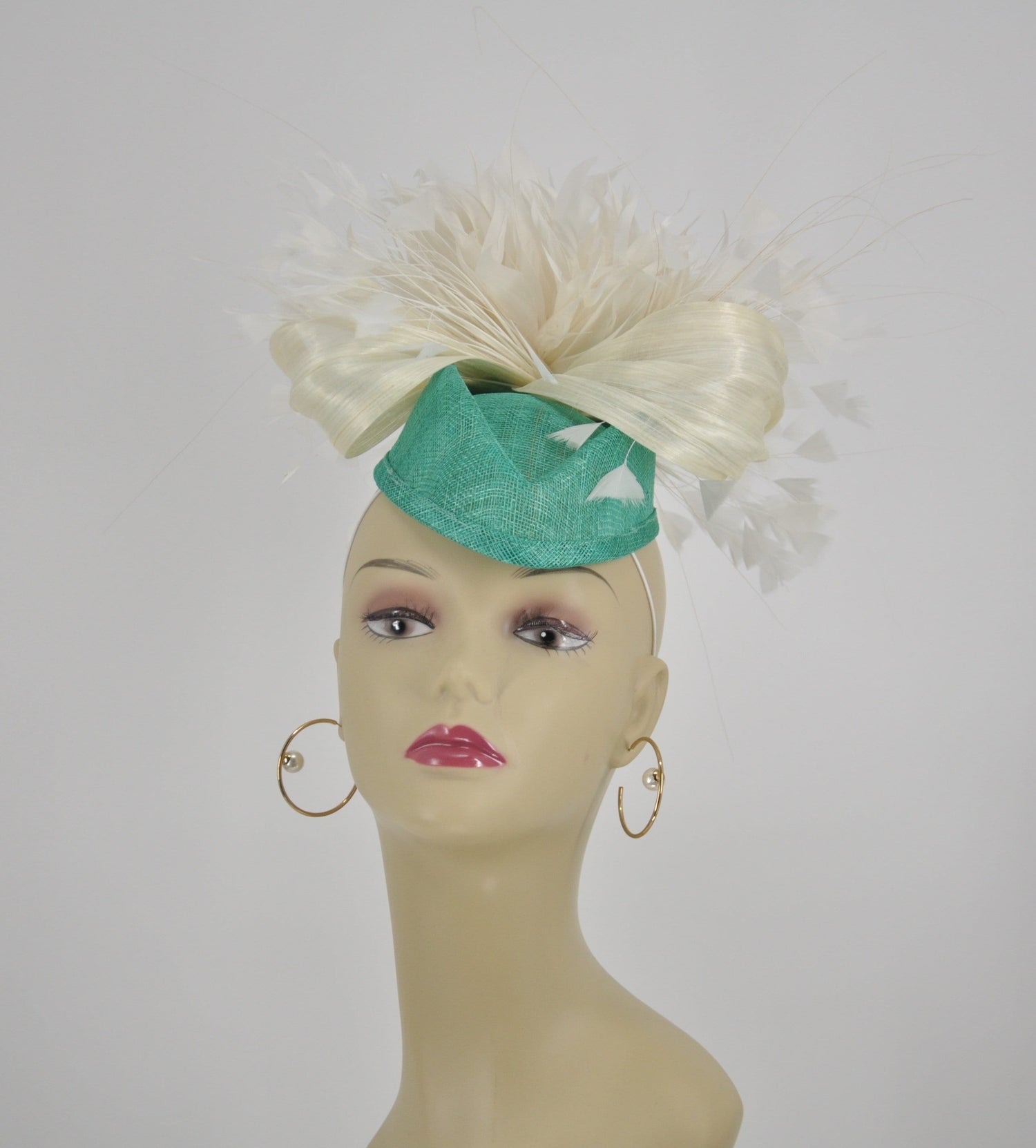 Turquoise Sinamay Kentucky Derby Fascinator: Ivory Flowers, Silk Bow