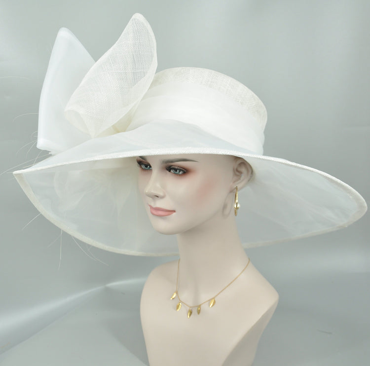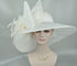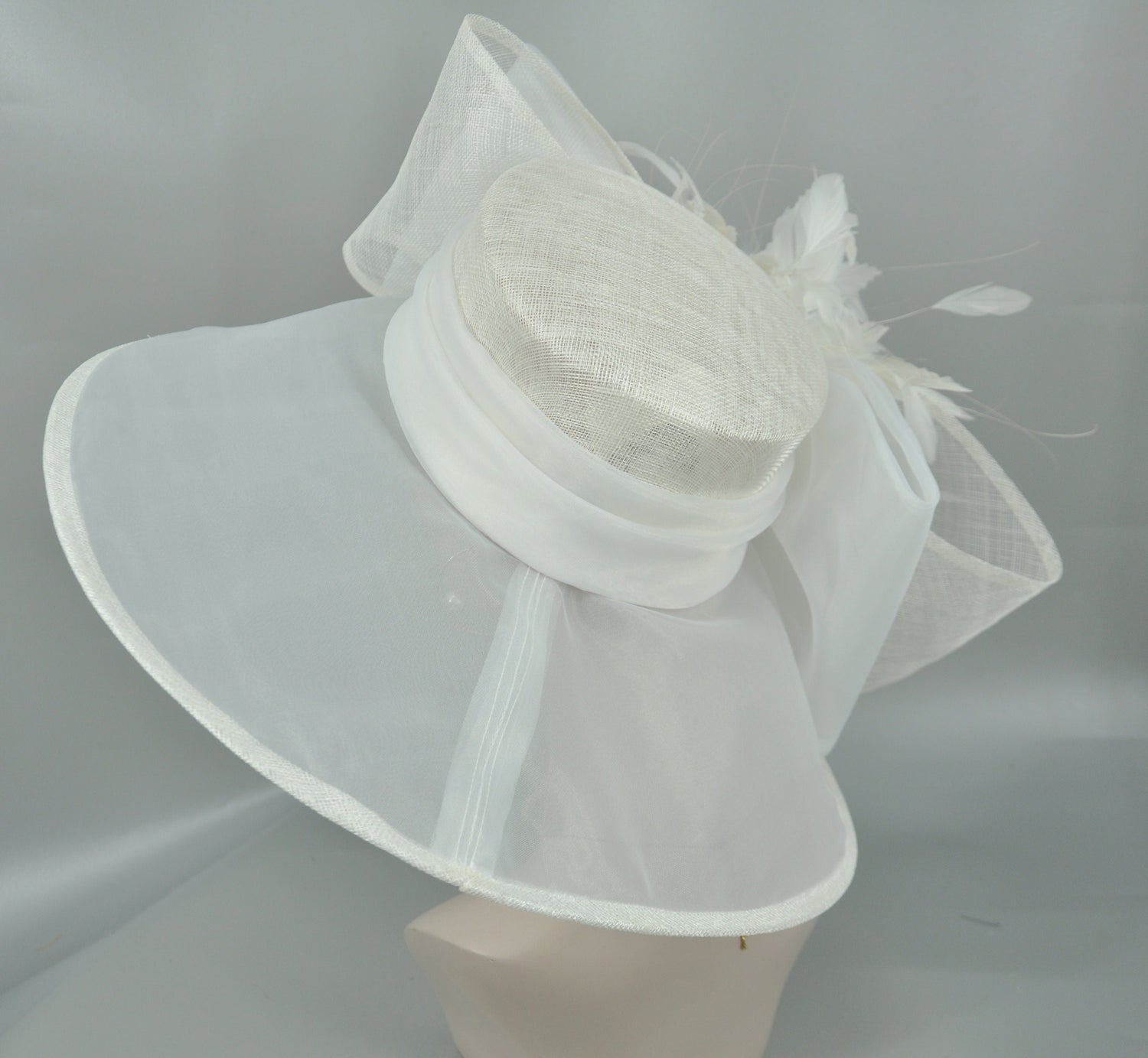 White Feather Flower Derby Hat: Wide Brim Sinamay Organza