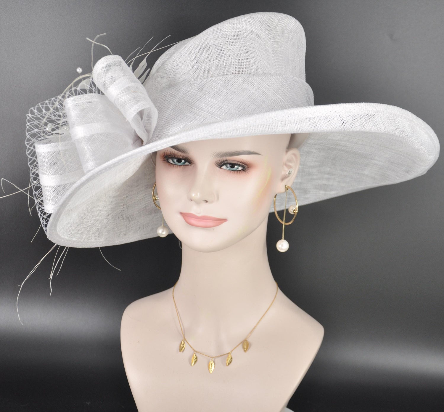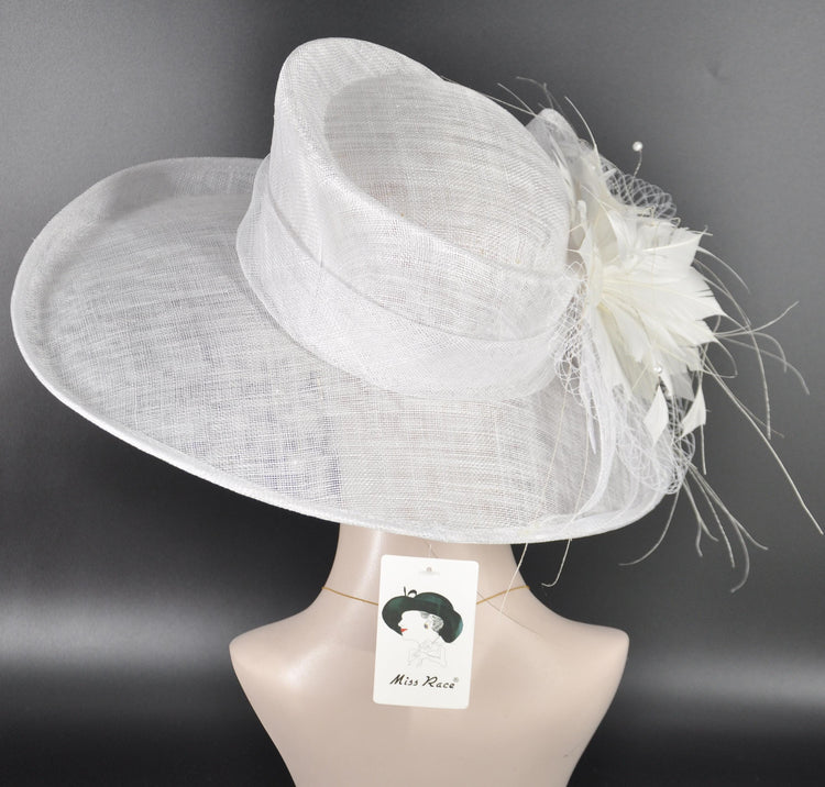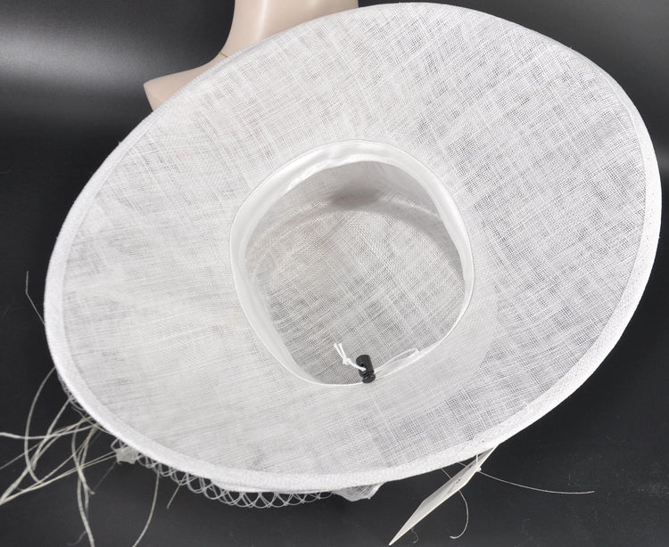 This stunning handcrafted Derby hat is designed to make a statement at any special event. Featuring elegant White sinamay, vibrant White accents, decorative bows, and luxurious feathers, this wide-brim hat adds a sophisticated finishing touch to your race-day or formal outfit. Perfect for the Kentucky Derby, Royal Ascot, garden parties, weddings, or any occasion where you want to stand out with timeless elegance.