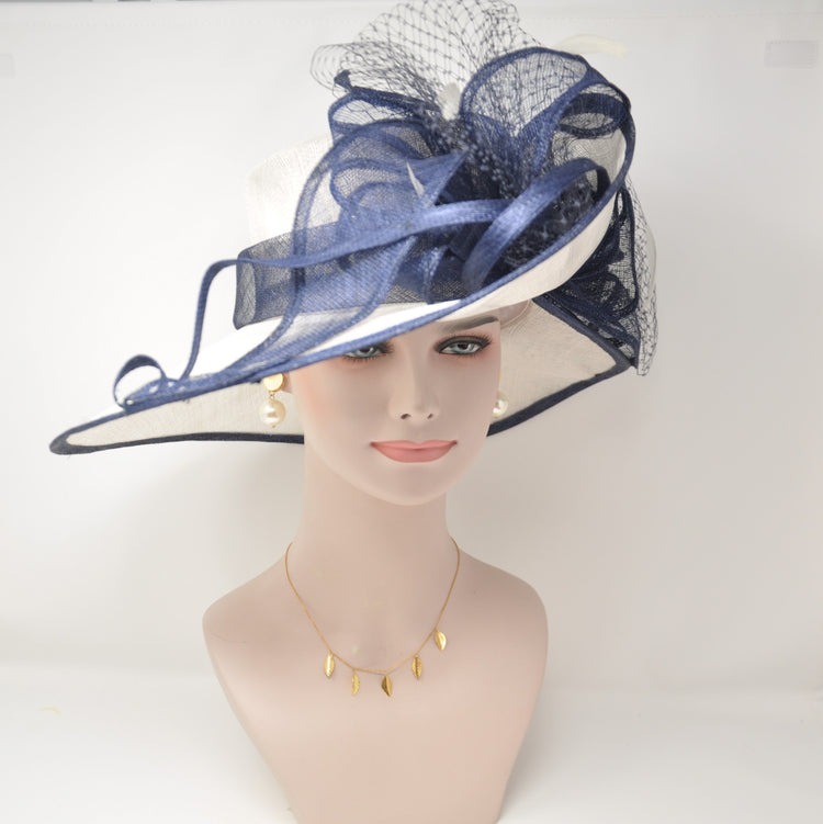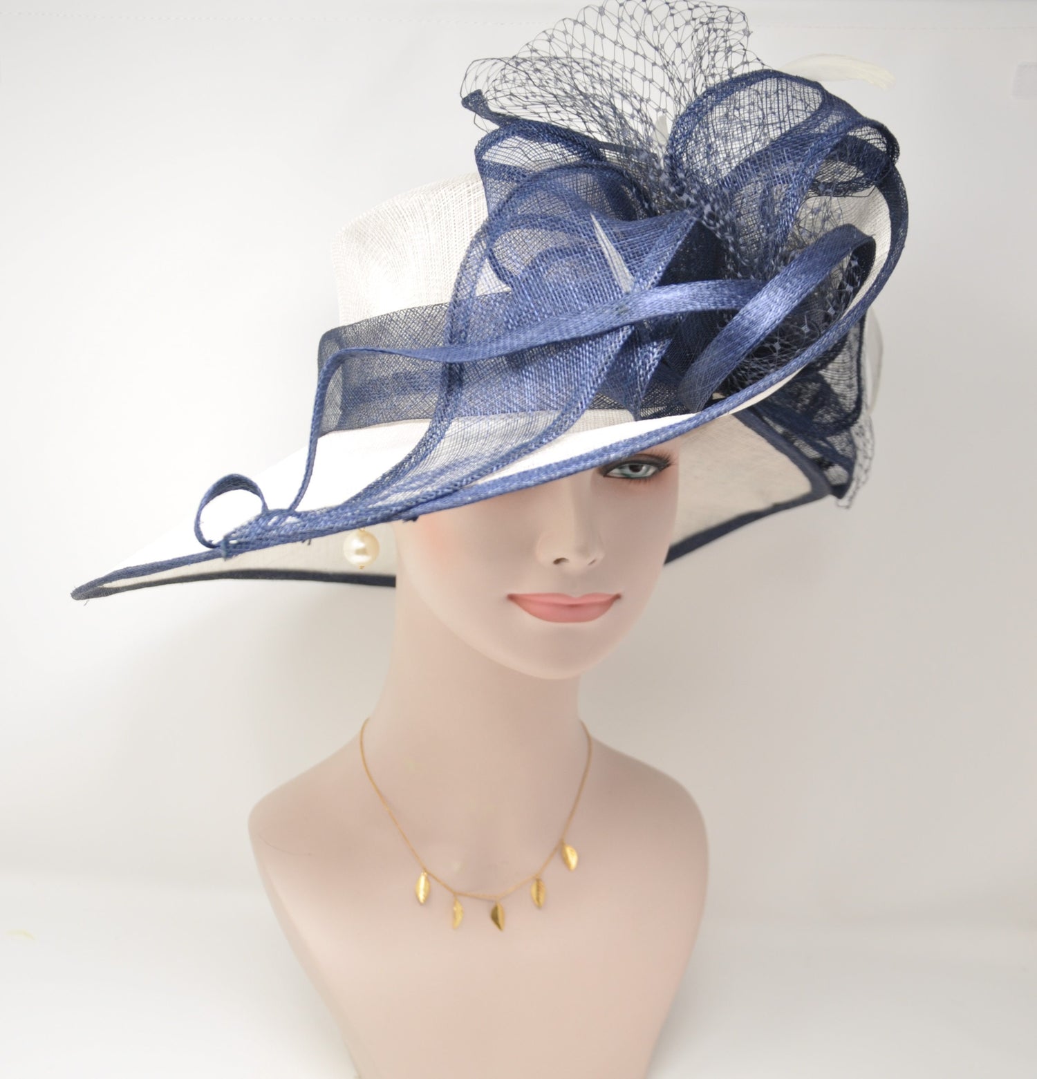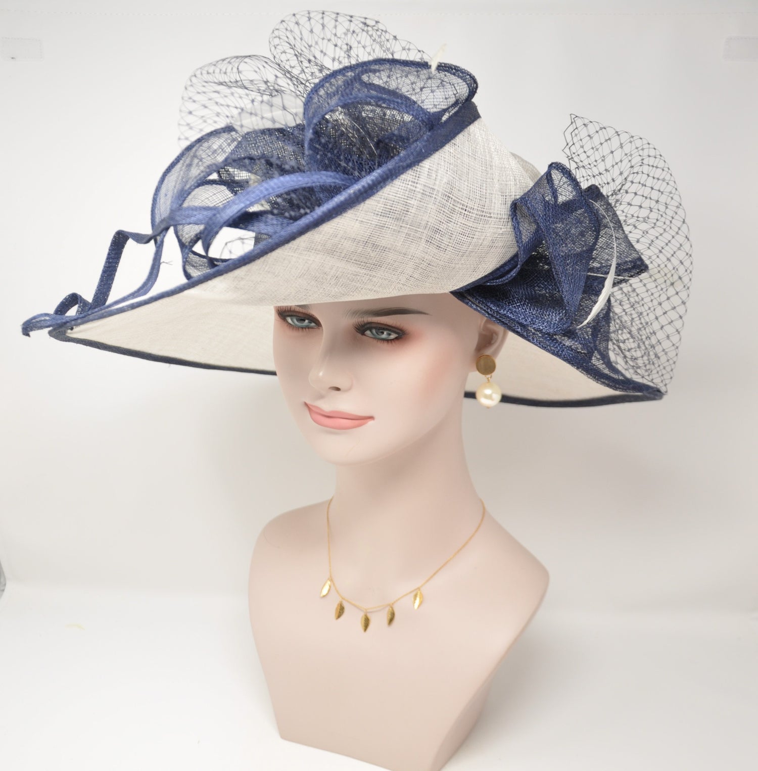 White & Navy Sinamay Derby Hat: Wide Brim Kentucky Tea Party