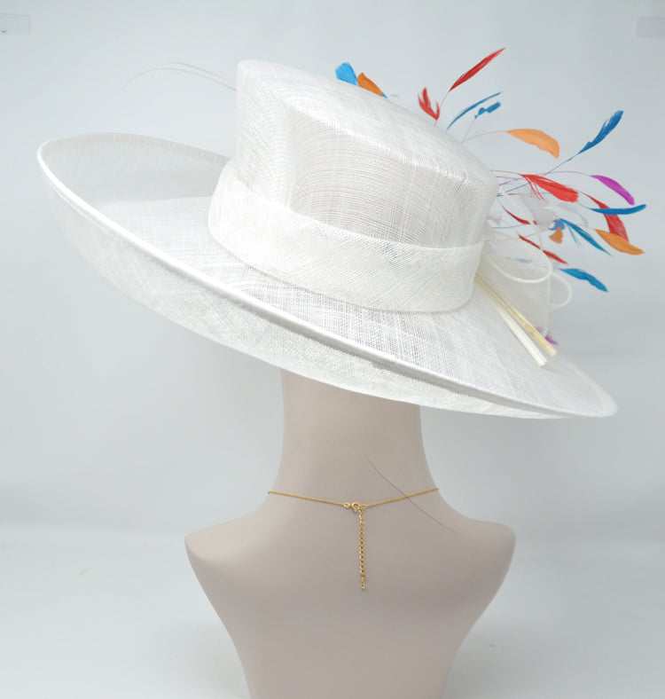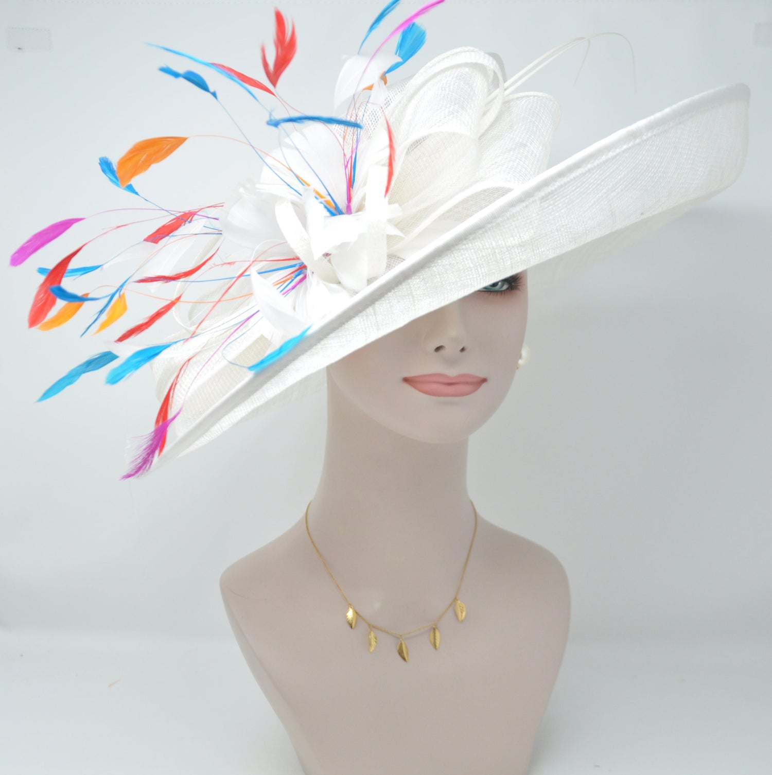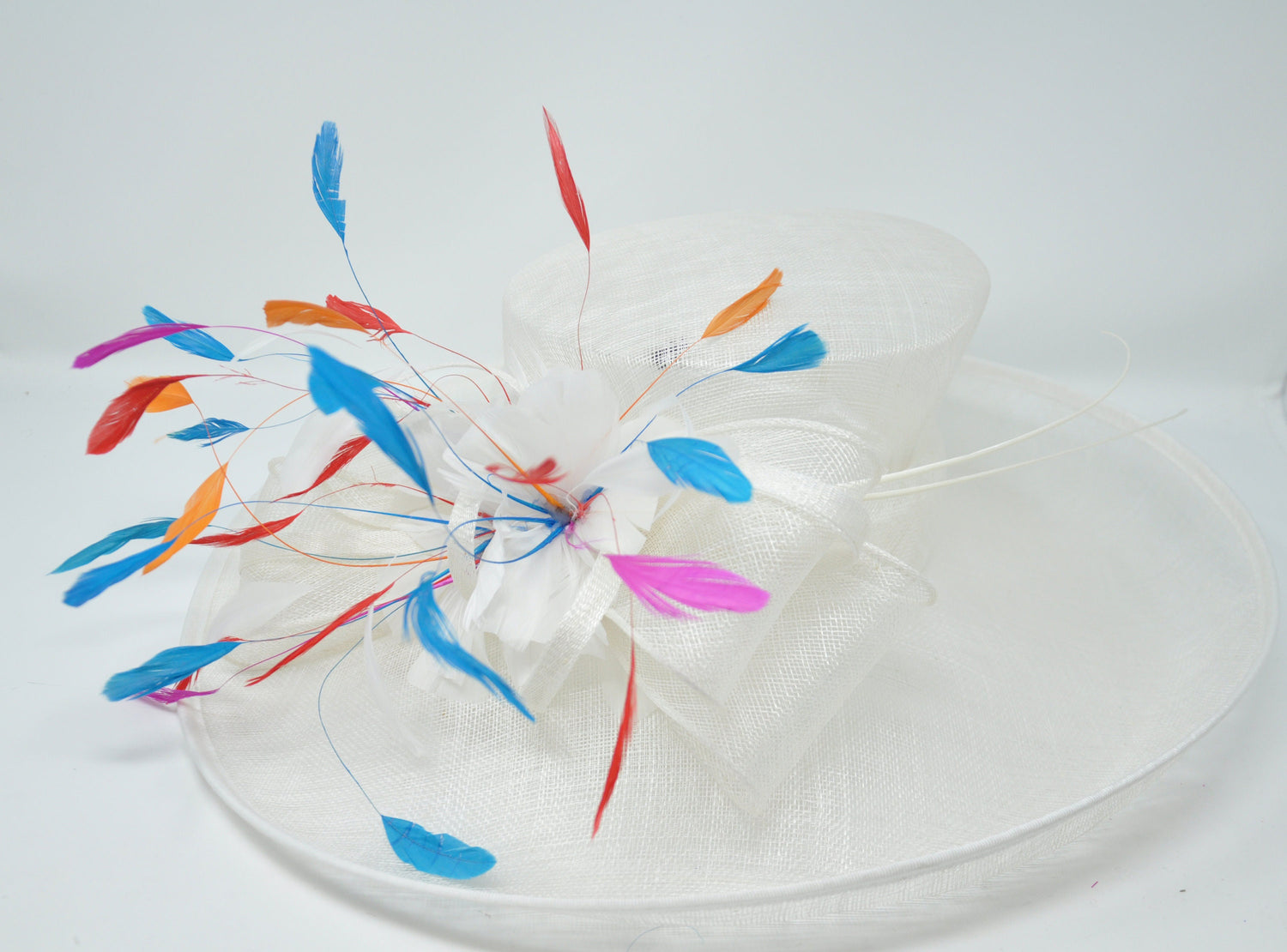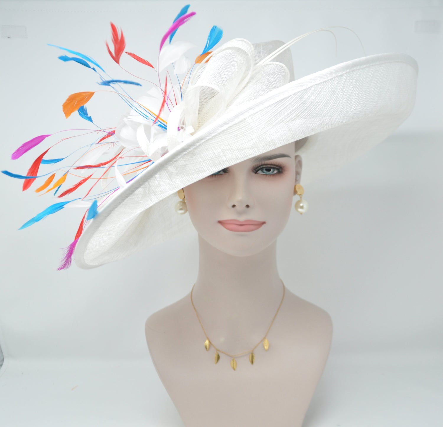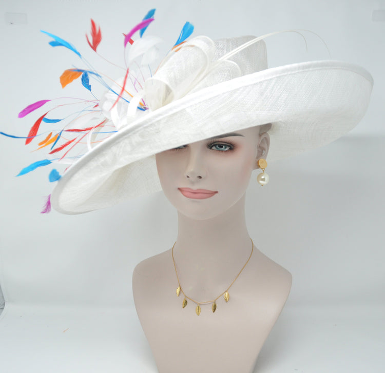 White Sinamay Derby Hat: Wide Brim Feathered Church Wedding Hat