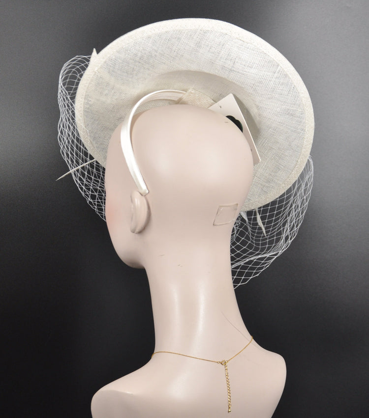 Have questions? Feel free to reach out—we’re happy to help!.Sinamay Disc Fascinator Hat with Feathers and Netting