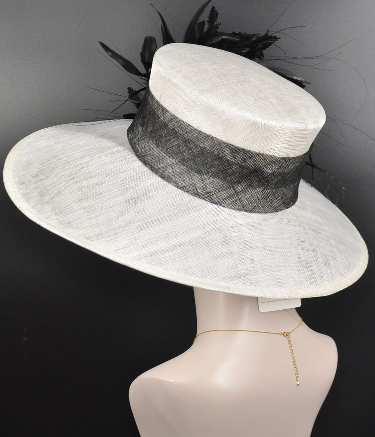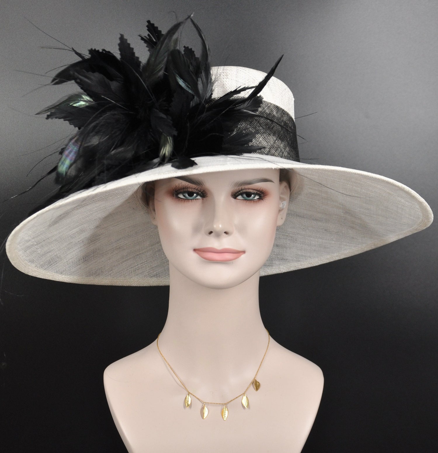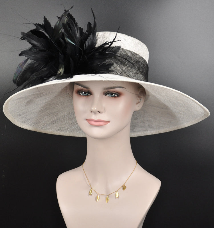 White Sinamay Kentucky Derby Hat: Black Feather Flower, Wide Brim