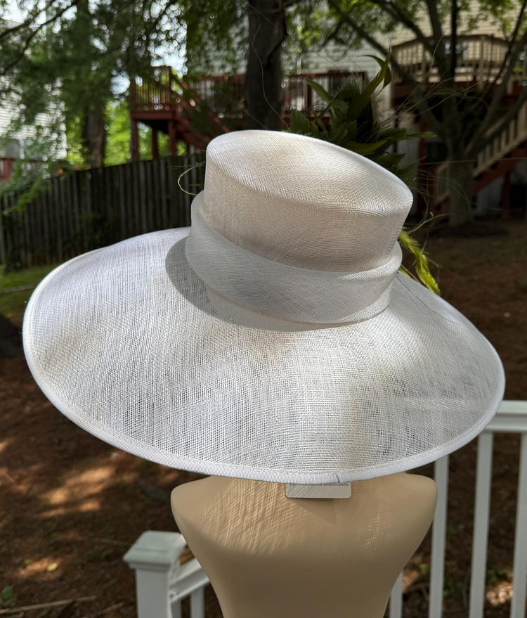 White Sinamay Kentucky Derby Hat: Feather Flower Wide Brim
