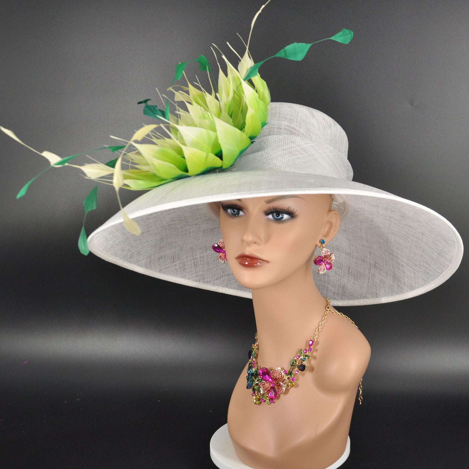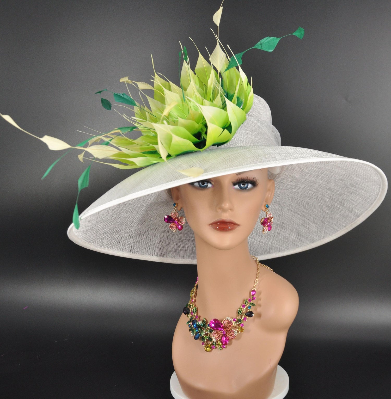 White Sinamay Kentucky Derby Hat: Green Feather Flower Wide Brim