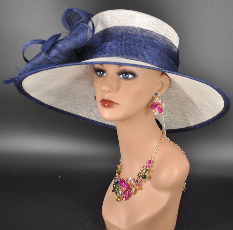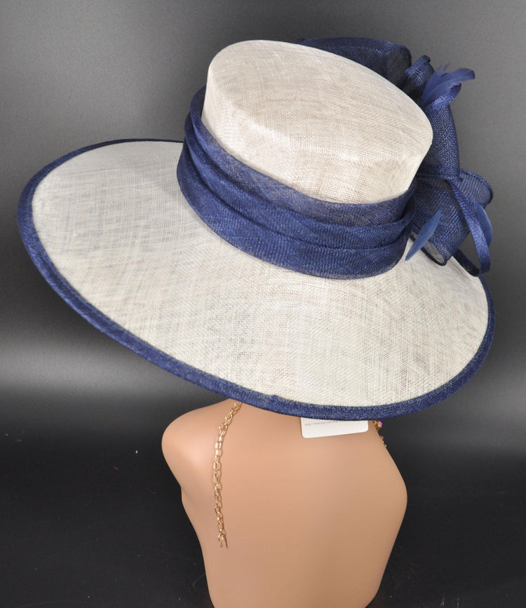 White Sinamay Kentucky Derby Hat: Navy Blue Wide Brim Formal Hat