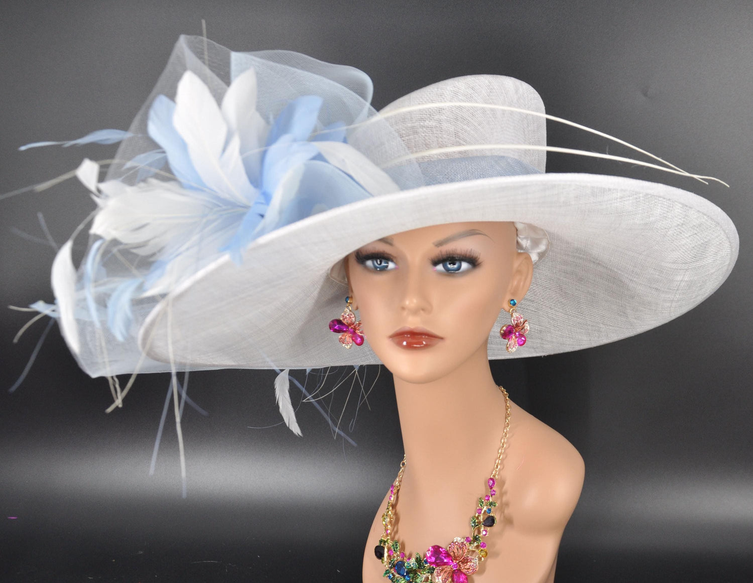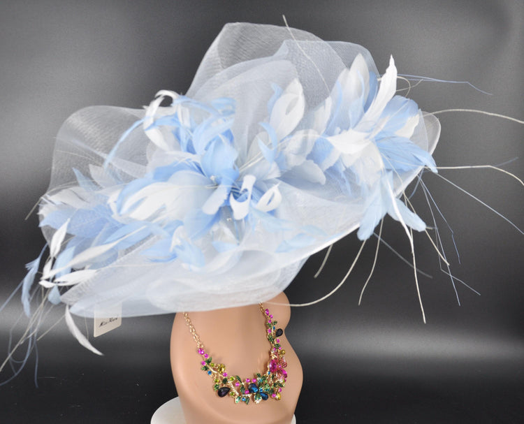White Sinamay Kentucky Derby Hat: Powder Blue Feather Floral Wide Brim