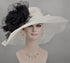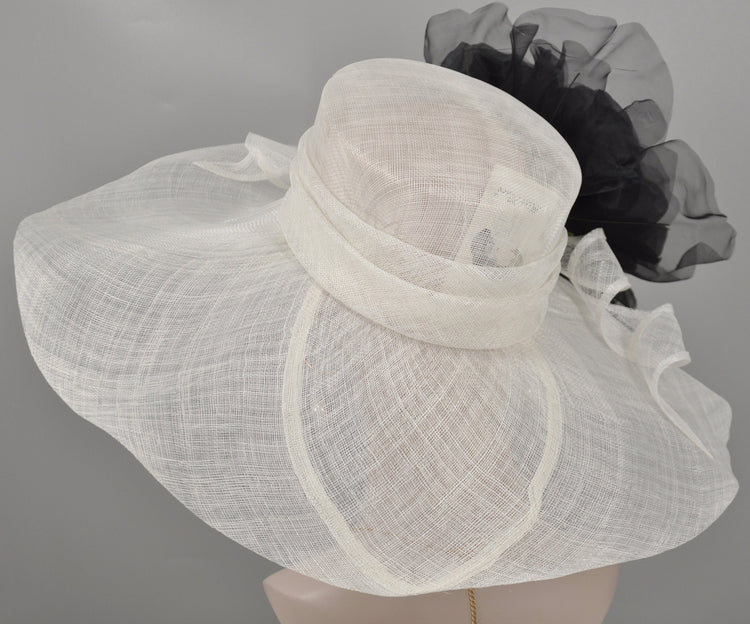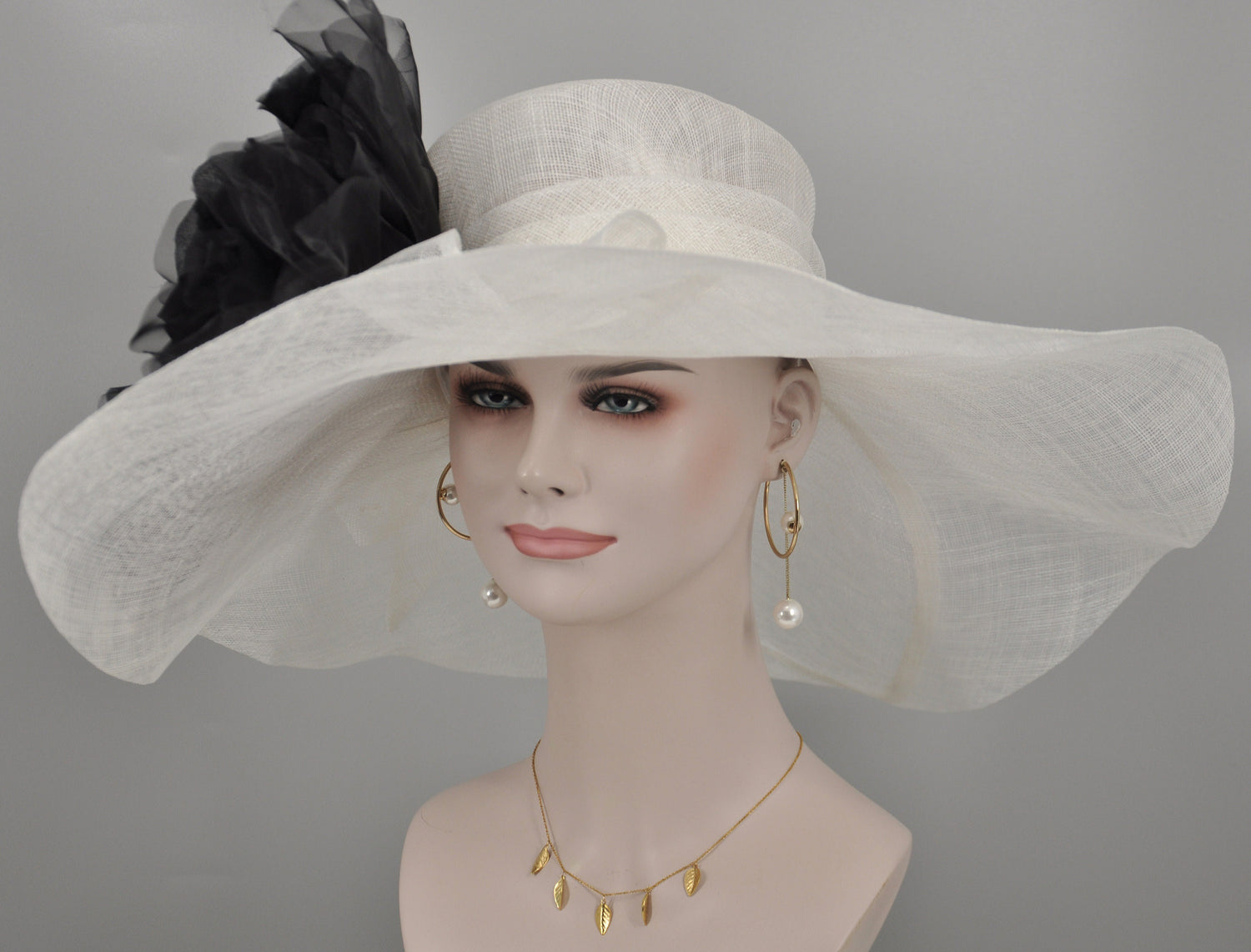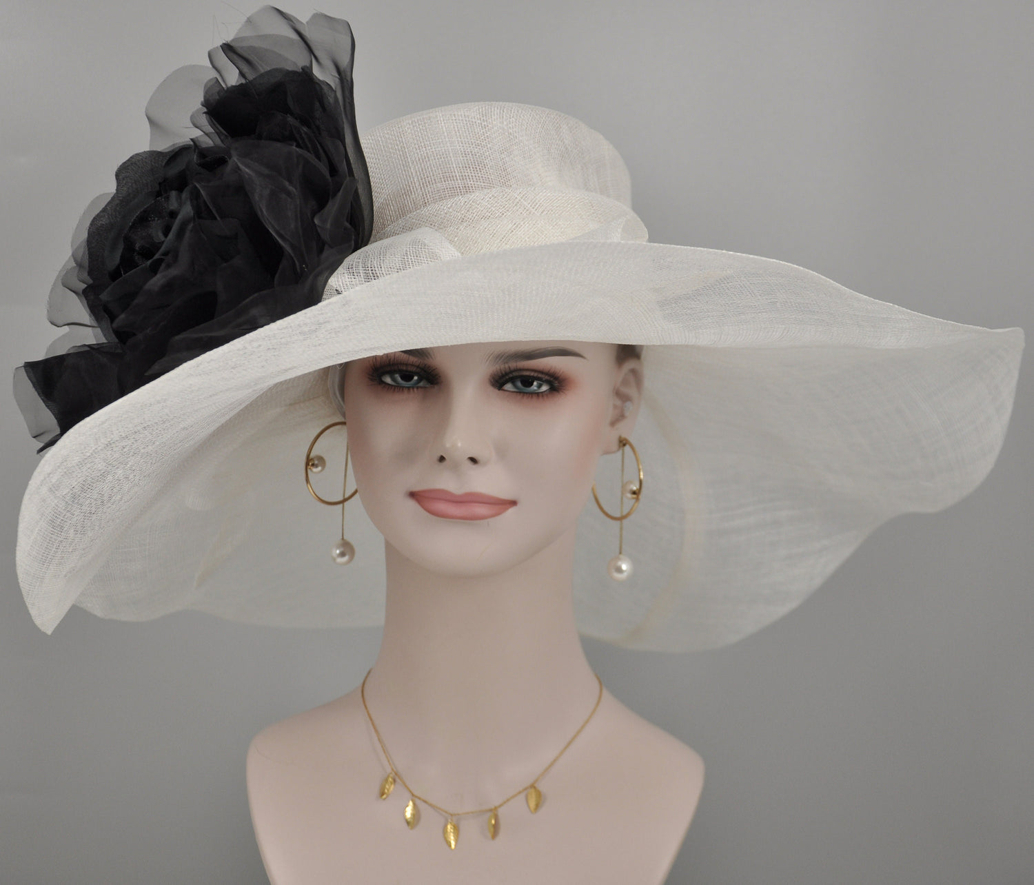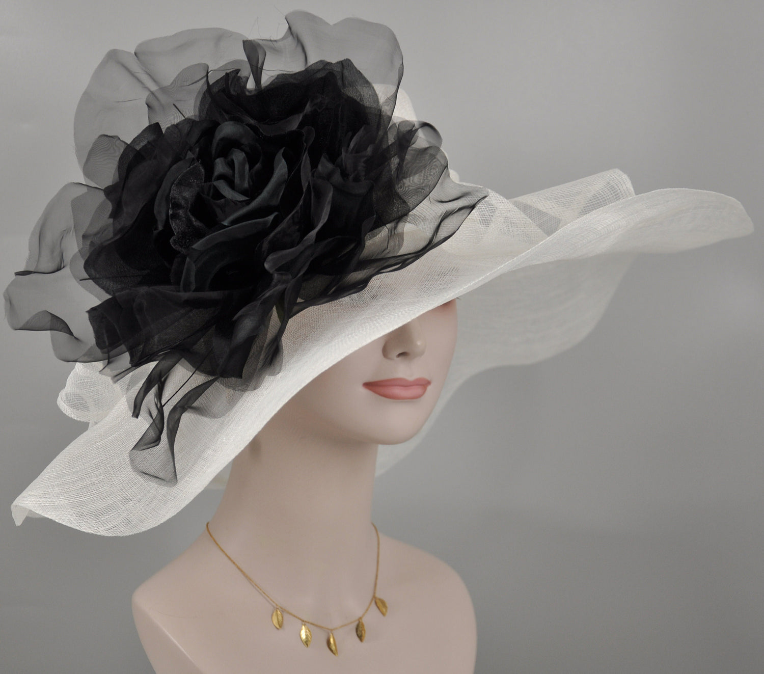 White w Black Jumbo Silk Flower, Kentucky Derby hat, Church hat, Wedding hat, Tea Party hat , Floppy Wide Brim Sinamay Dress Hat
