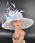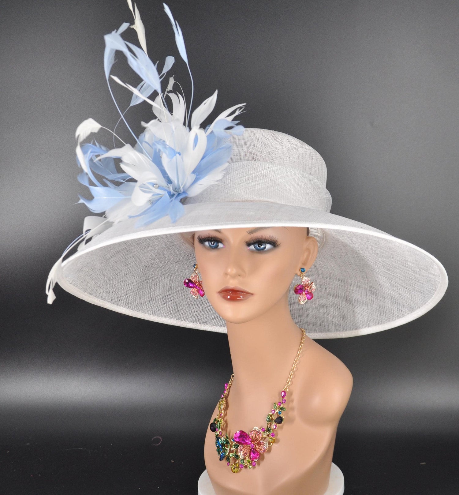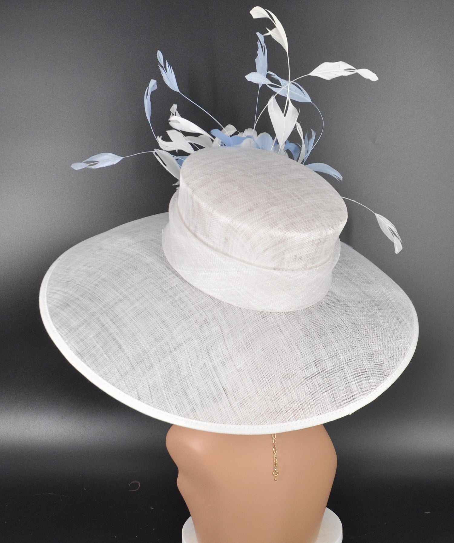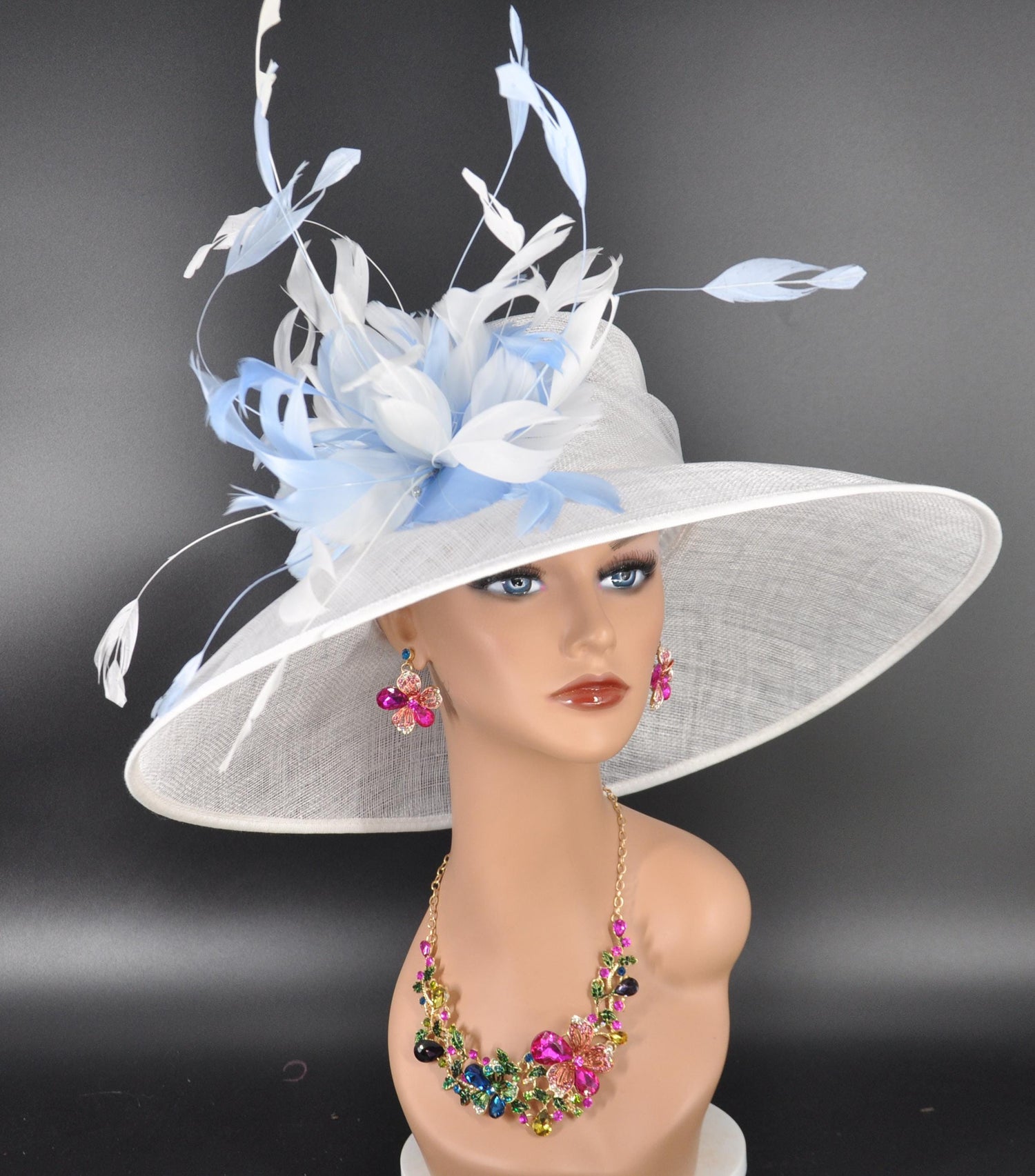 White w Light Blue Feather Flowers Kentucky Derby Hat Tea Party Carriage Party Wide Brim Sinamay Hat