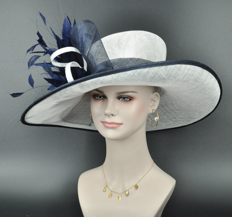 White w Navy Blue Feather Flower Kentucky Derby Hat Tea Party Carriage Party