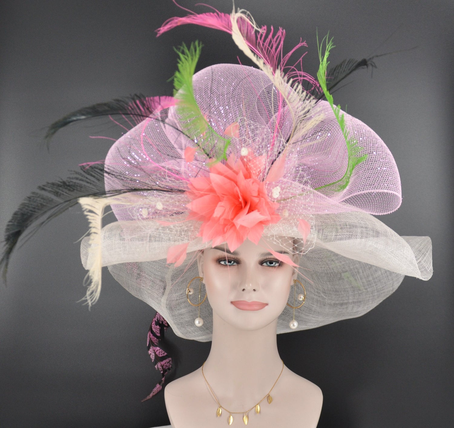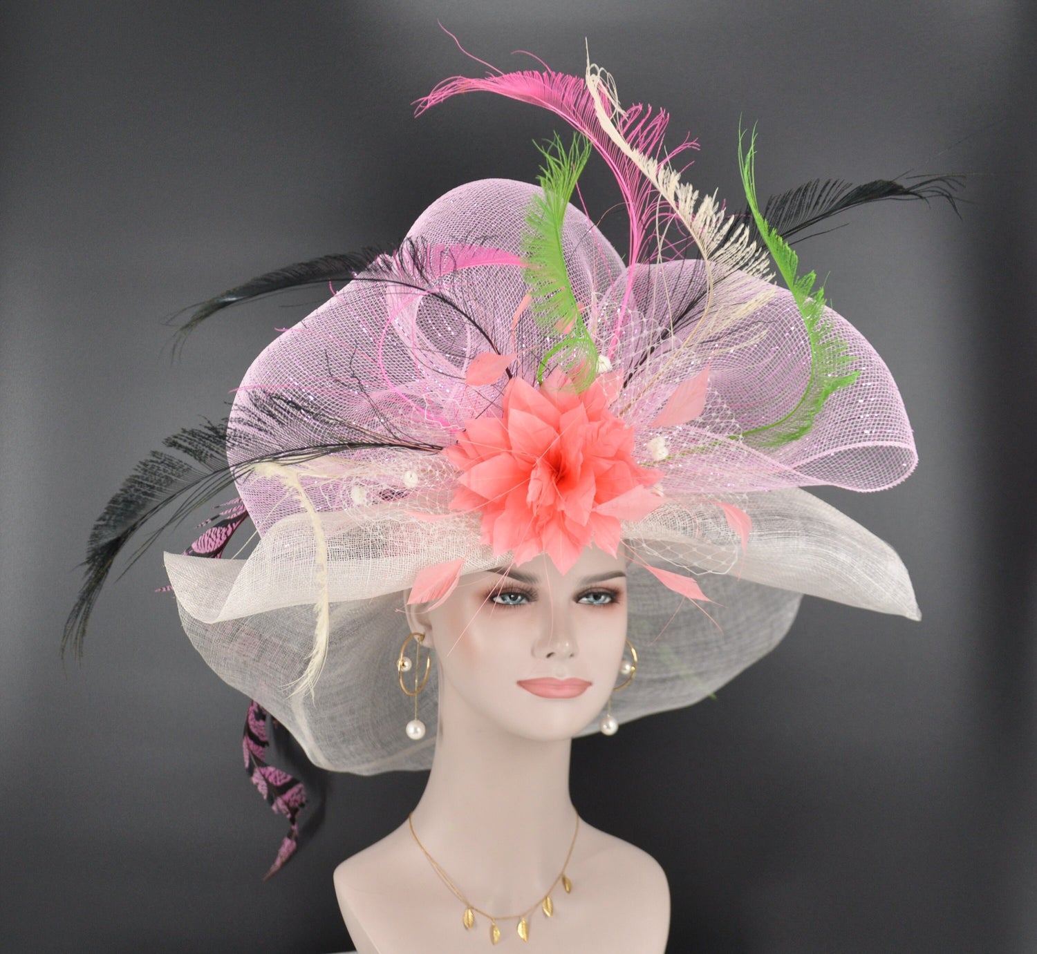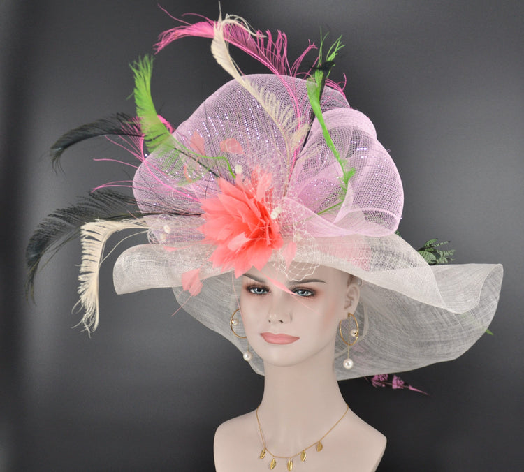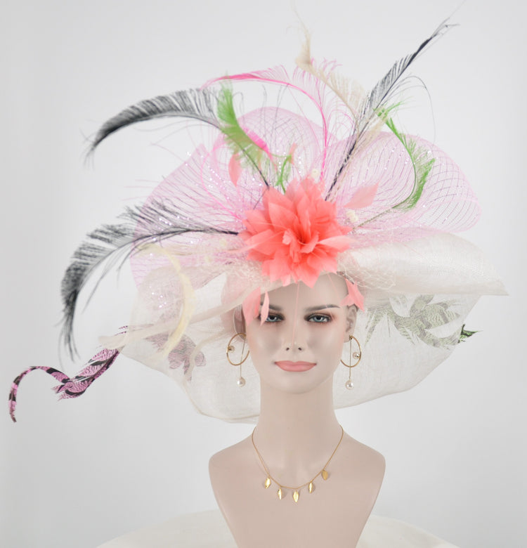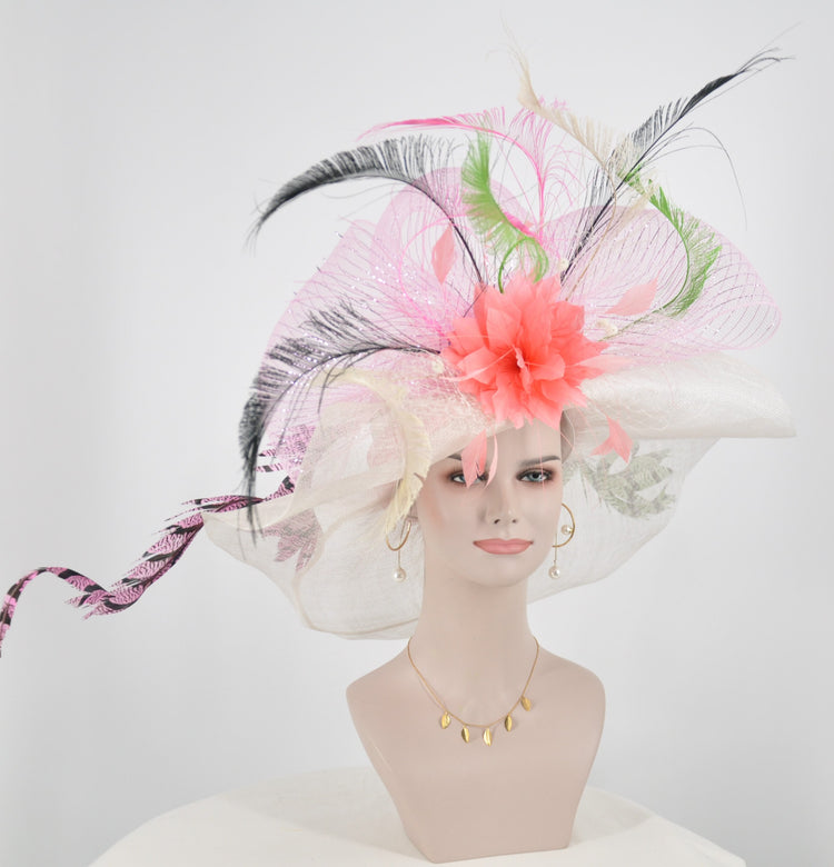 White w Pink Jumbo Bow and Feather Flowers Kentucky Derby Hat, Tea Party Hat Wide Brim Sinamay Hat