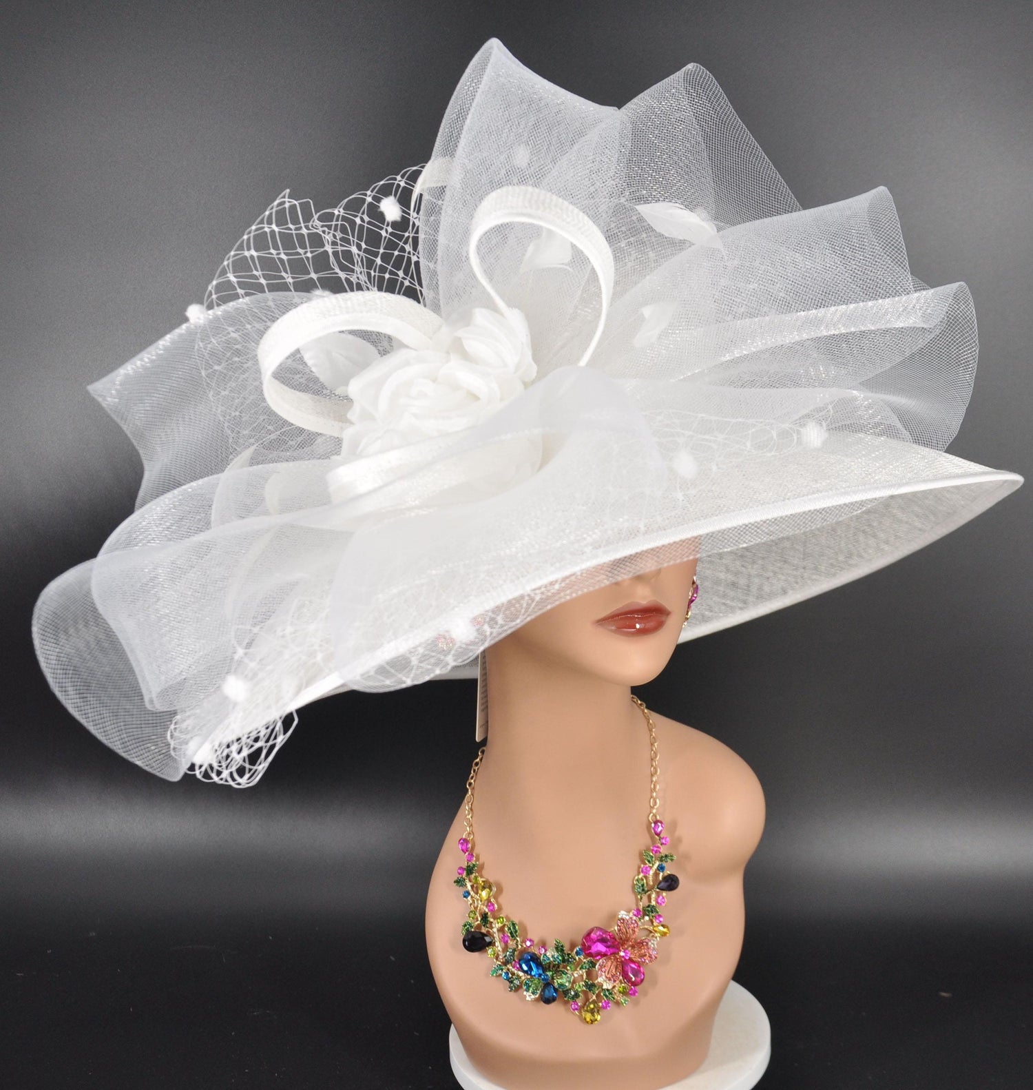 Step into sophistication with this breath taking White wide-brim Derby hat. Designed for elegance and charm, this stunning piece features delicate layers of airy sinamay, artfully sculpted into a flowing bow adorned with crin and fine netting. The soft pastel hue exudes grace, making it a perfect choice for the Kentucky Derby, weddings, tea parties, and high-society events.