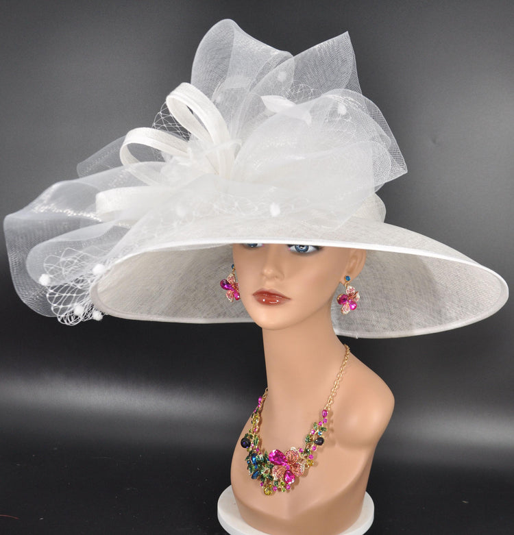 White Wide Brim Derby Hat: Elegant Sinamay Bow, Royal Ascot Style