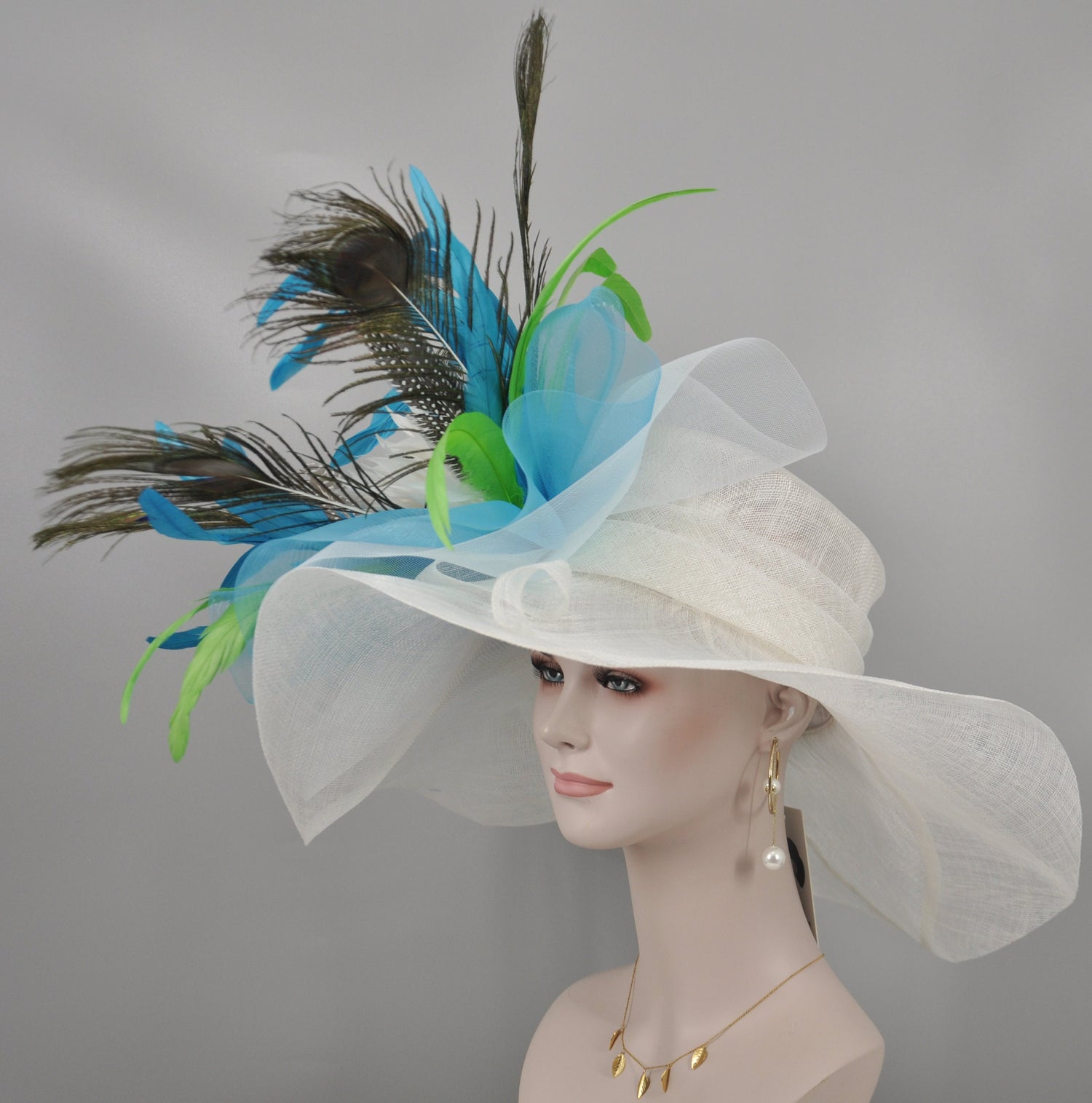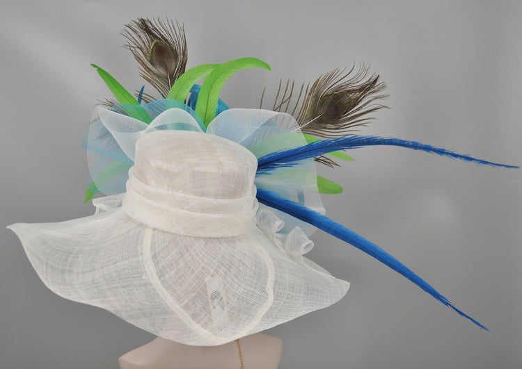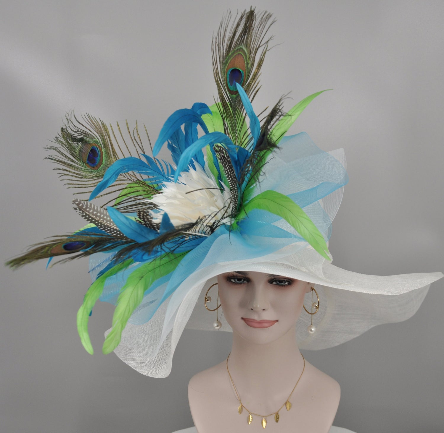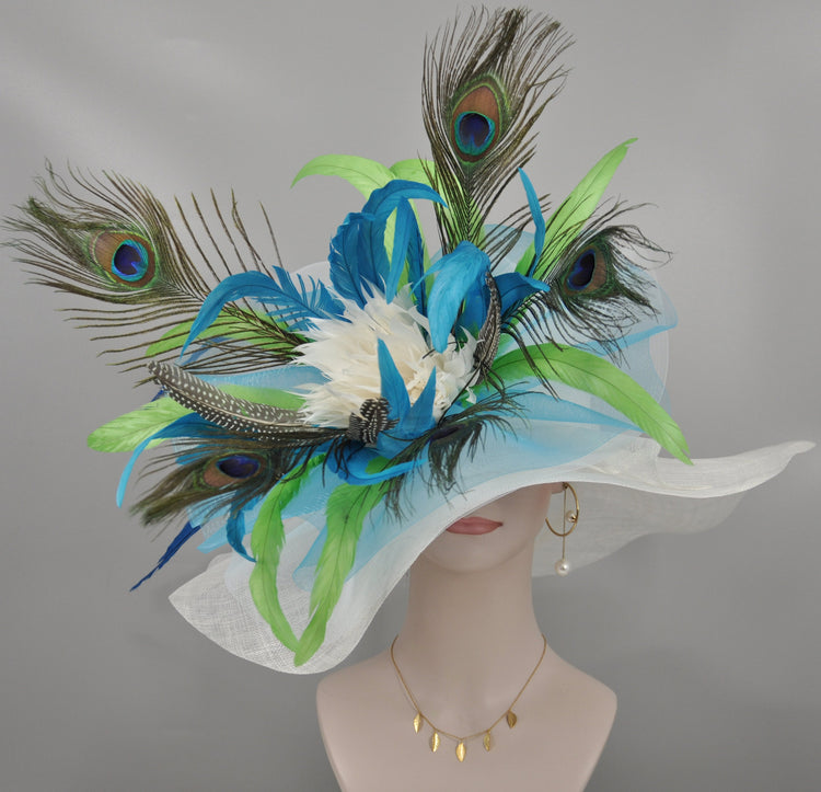 White Wide Brim Sinamay Hat Kentucky Derby Hat w Teal Blue White Green Turkey Peacocks Feather Flower Kentucky Derby Wedding Hat, Easter Hat