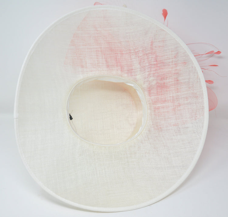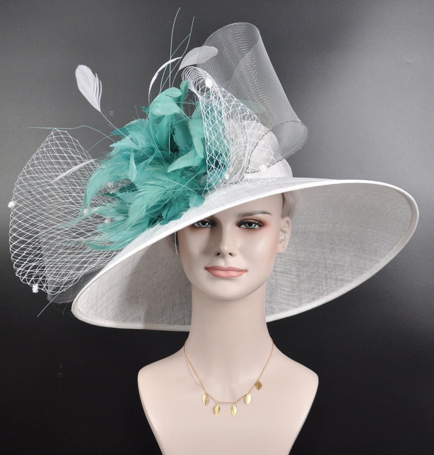 White with Aqua Gray Feather Flowers and Crin Kentucky Derby,Tea Party Carriage Party Royal AscotWide Brim Sinamay Hat