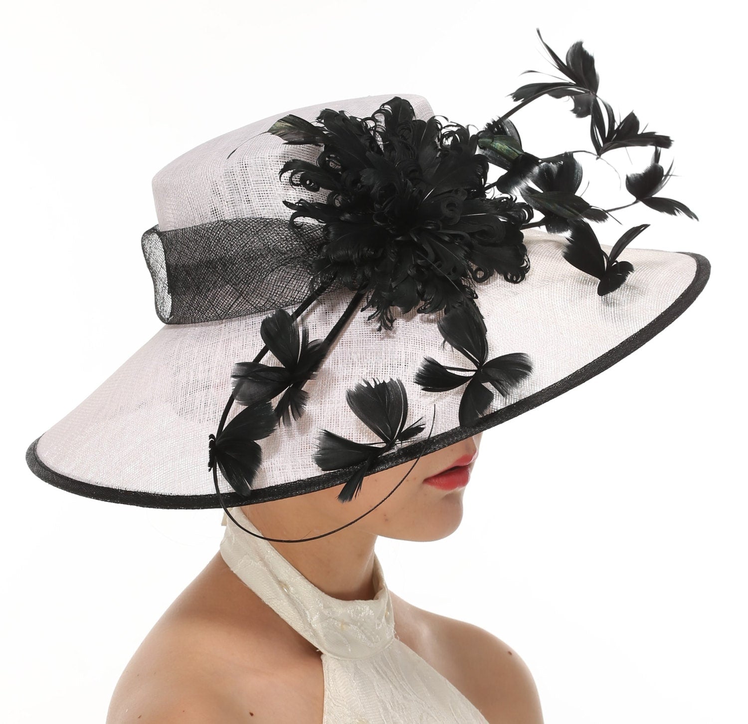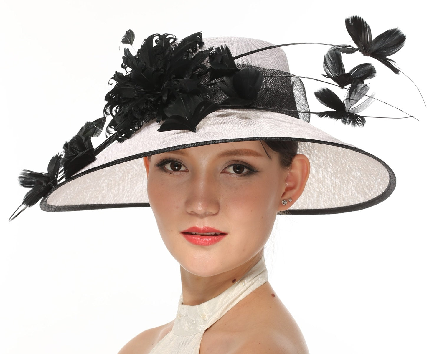 White with Black Kentucky Derby Hat, Church Hat, Wedding Hat, Easter Hat, Tea Party Hat Wide Brim Sinamay Hat