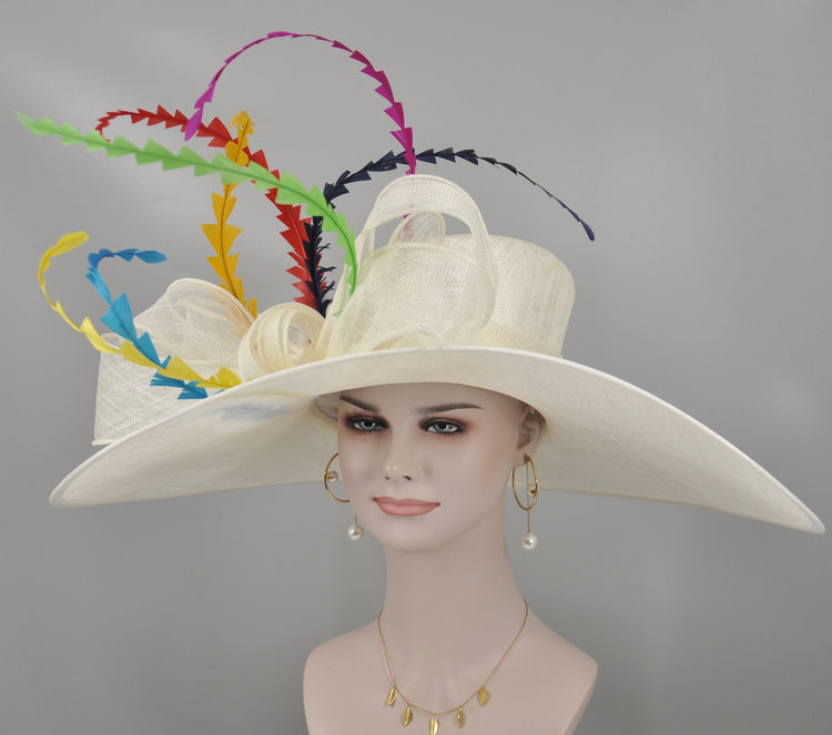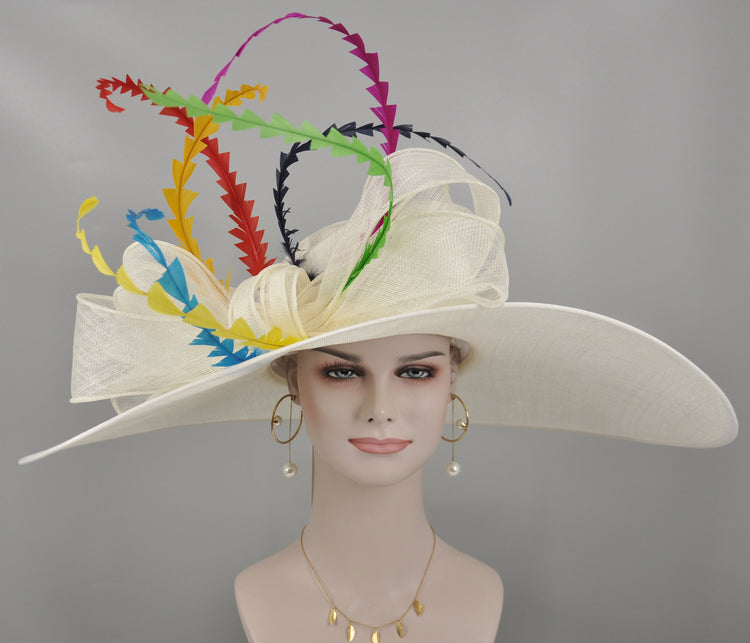 Wide Brim Feathered Derby Hat - Ivory Royal Ascot Sinamay Bow