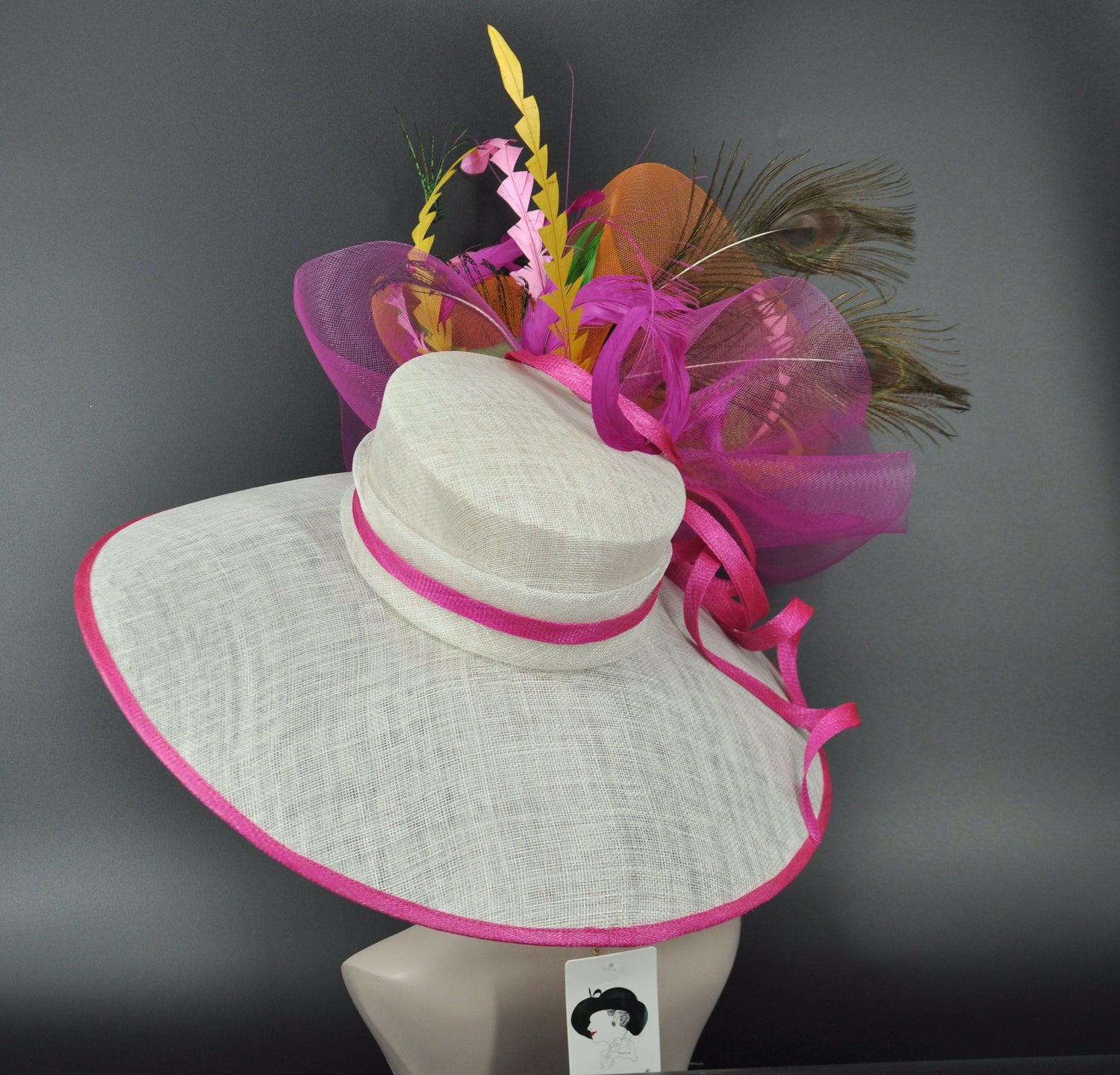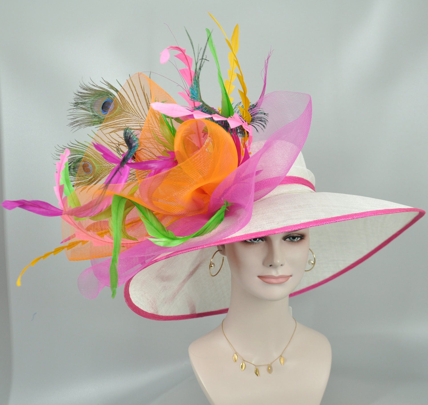 Wide Brim Kentucky Derby Hat: Fuchsia, Orange, Peacock Feather Flower