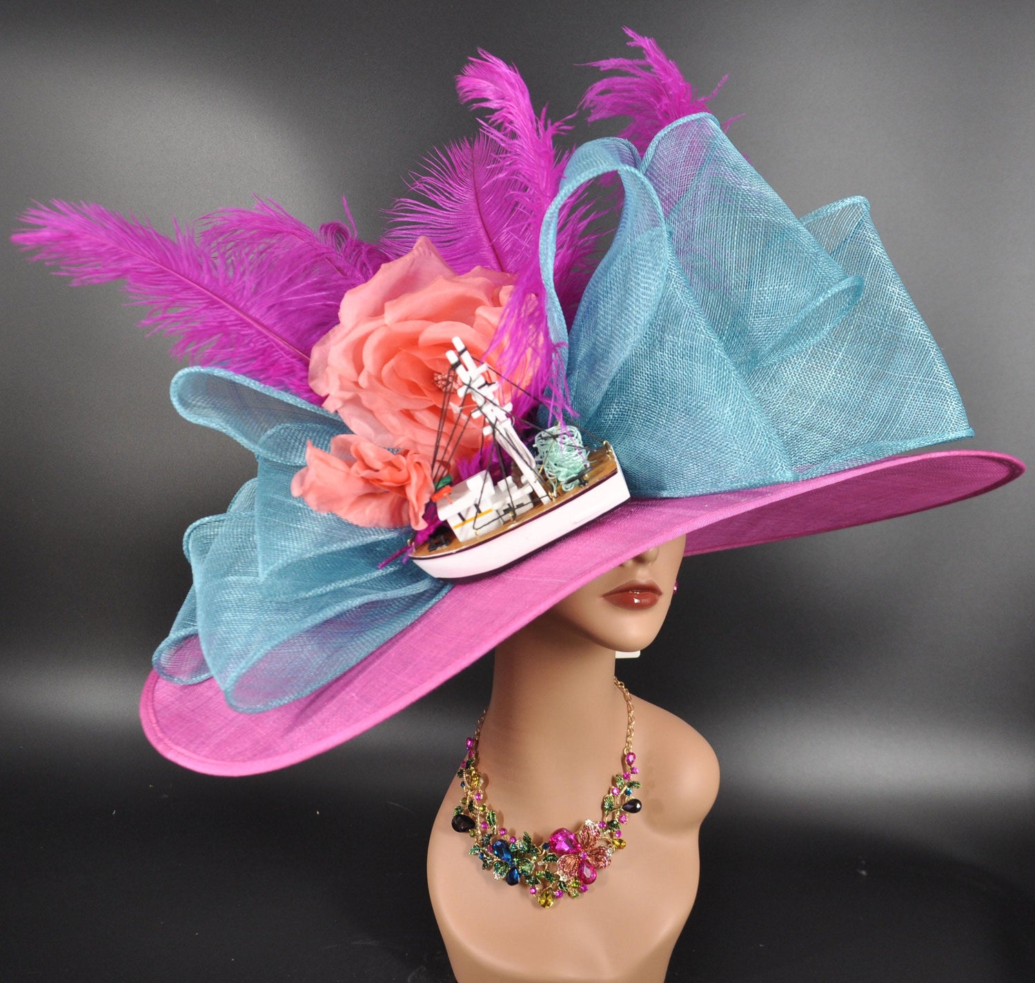 Wide Brim Kentucky Derby Hat: Fuchsia, Teal, and Coral Feather Fascinator