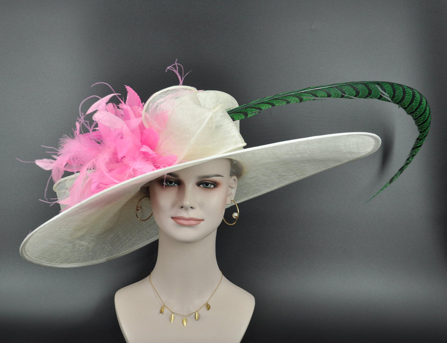 Wide Brim Kentucky Derby Hat: Ivory Sinamay with Pink Feather Flower