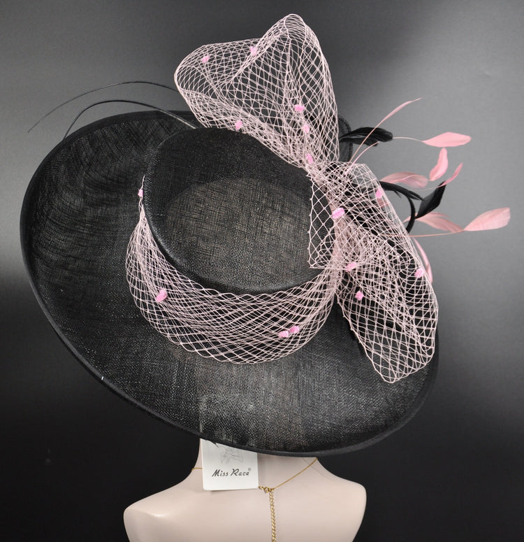 Wide Brim Sinamay Derby Hat: Black & Blush Pink Ascot Hat
