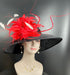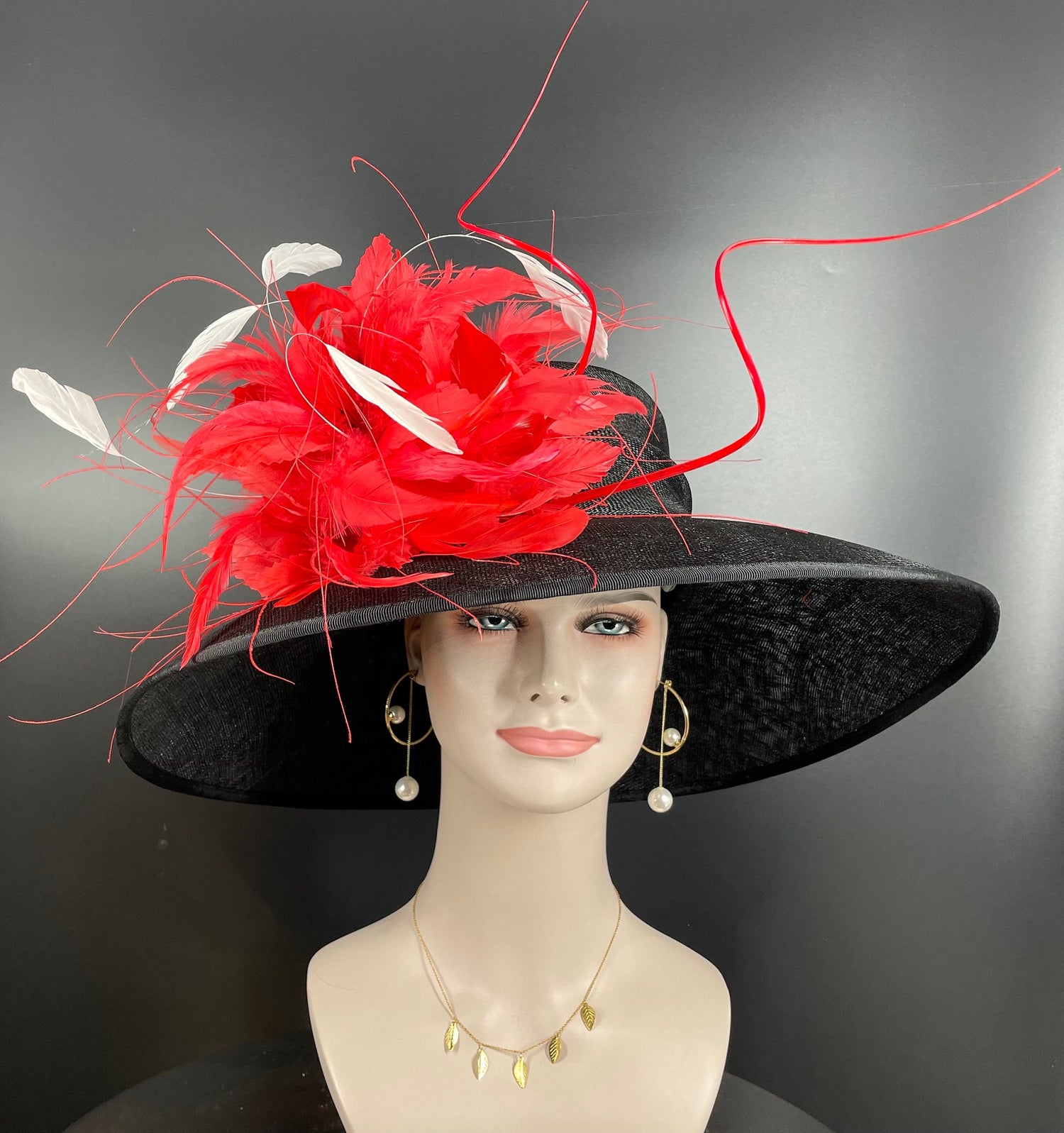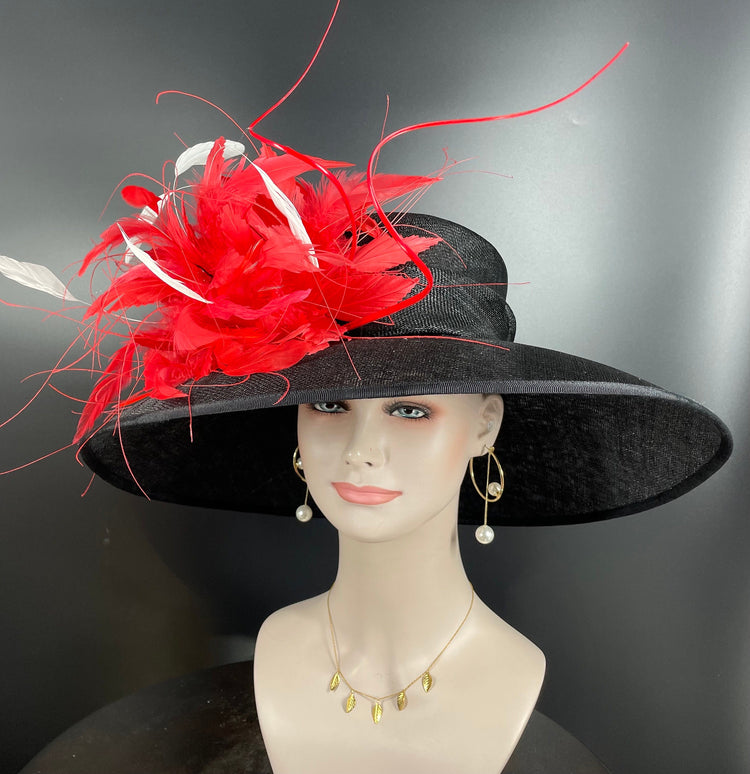 Wide Brim Sinamay Derby Hat: Black with Red Feather Flowers