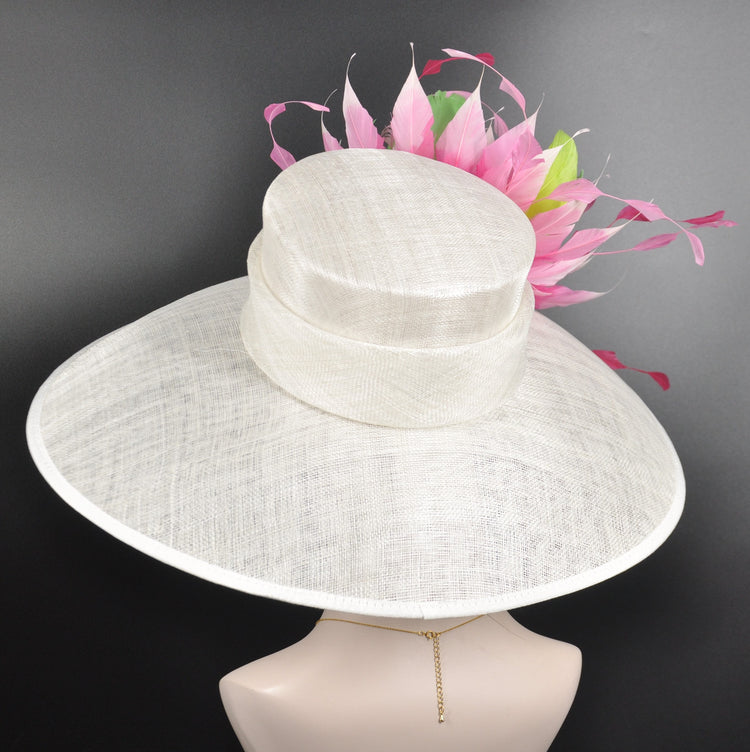 Wide Brim Sinamay Derby Hat: Feather Flower, Fuchsia Pink