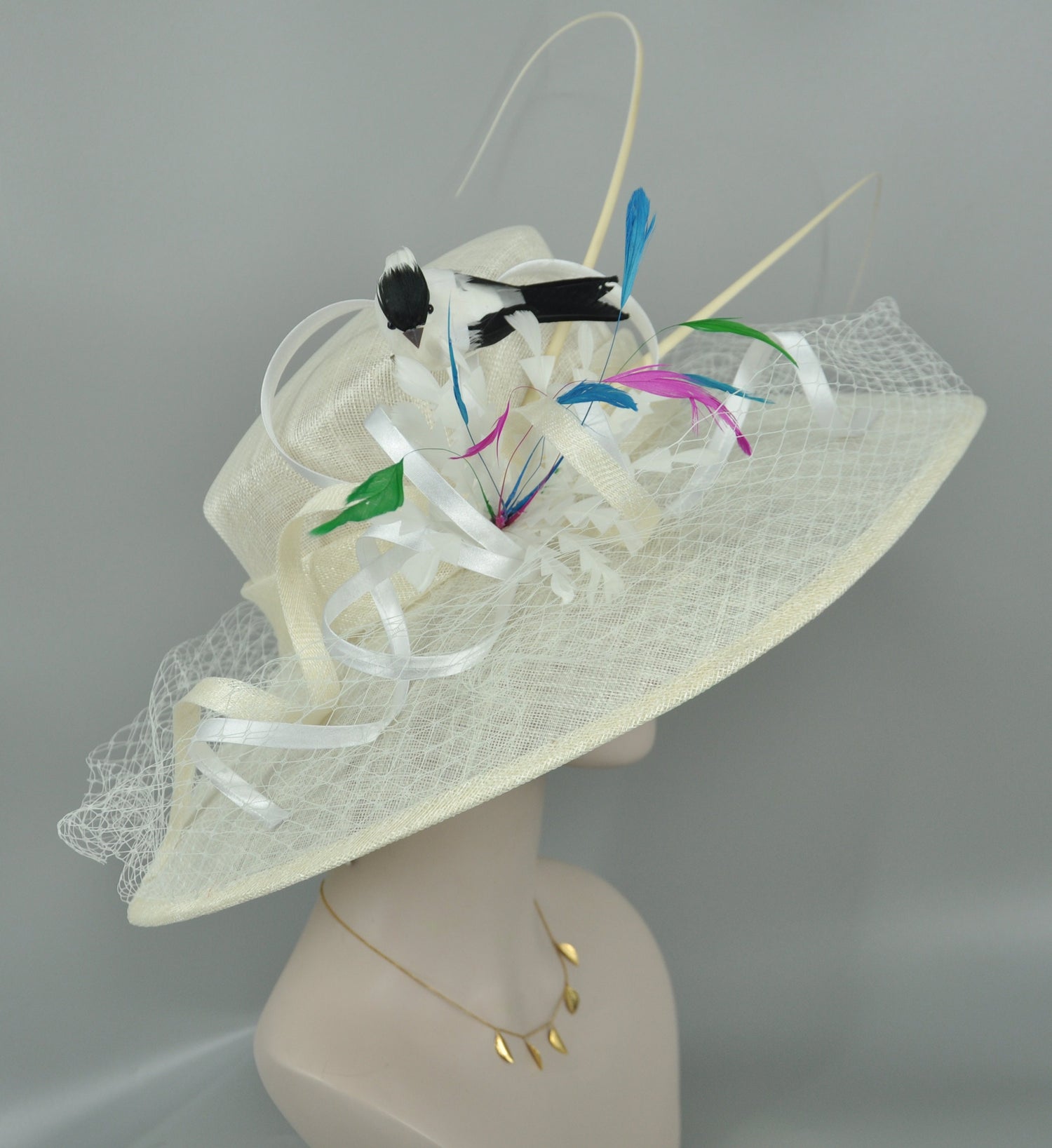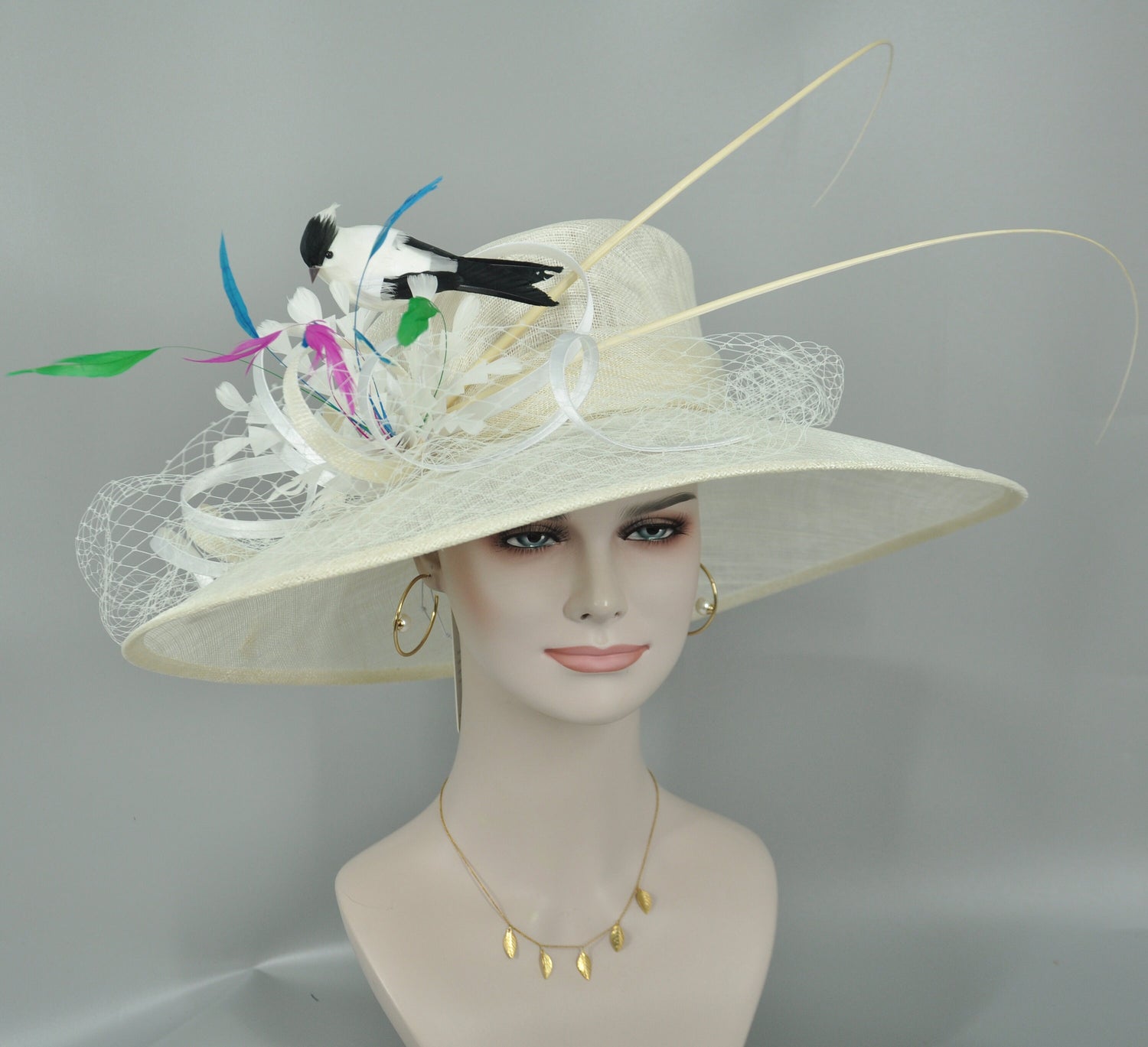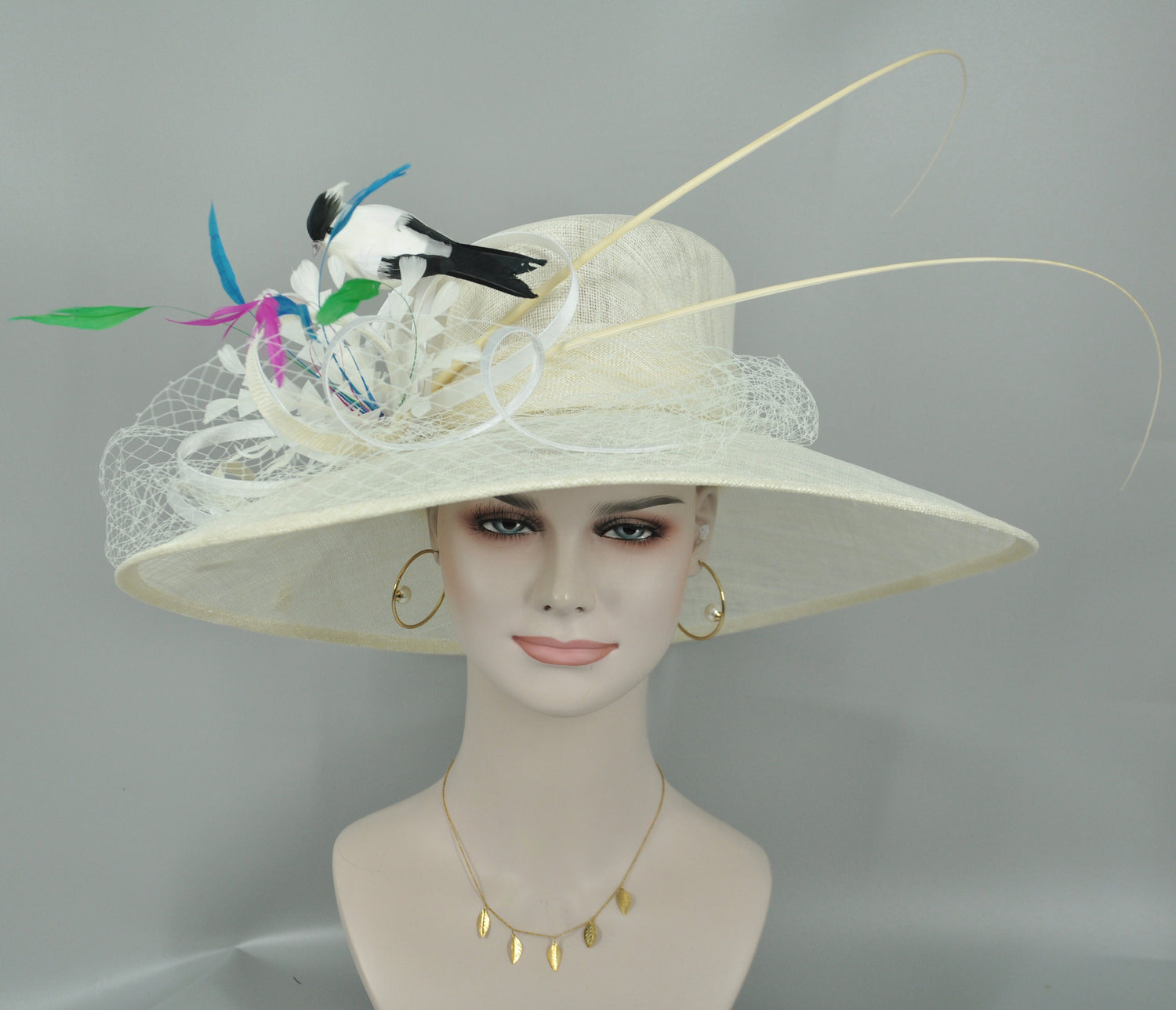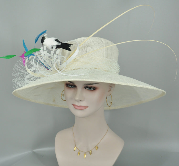 Wide Brim Sinamay Derby Hat: Feather Flower, Ostrich Quills