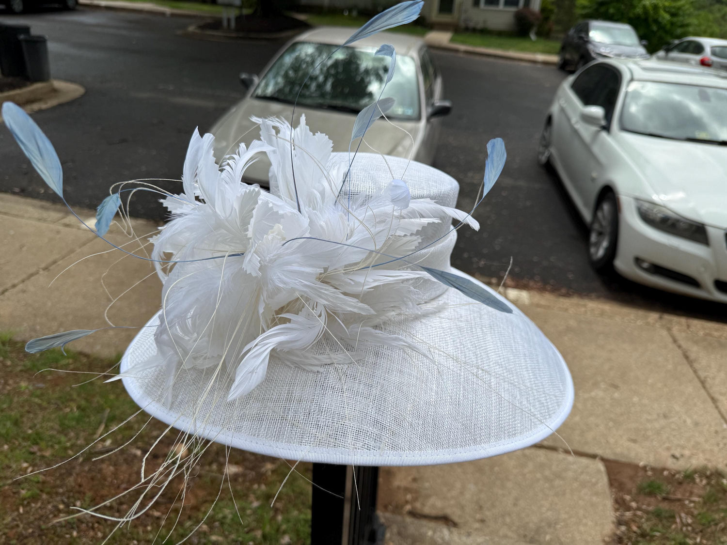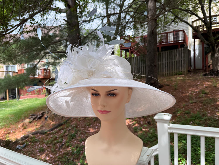 Wide Brim Sinamay Derby Hat: Feather Flower Wedding Church Hat