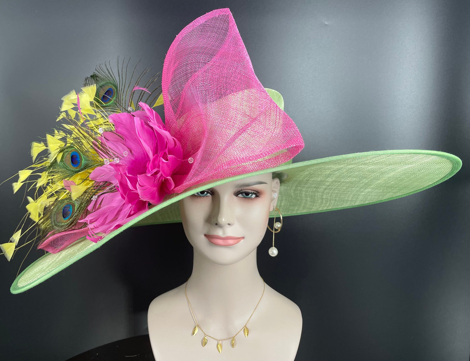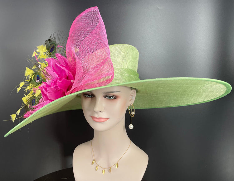 Wide Brim Sinamay Derby Hat: Green, Pink, Yellow Feather Ascot Hat