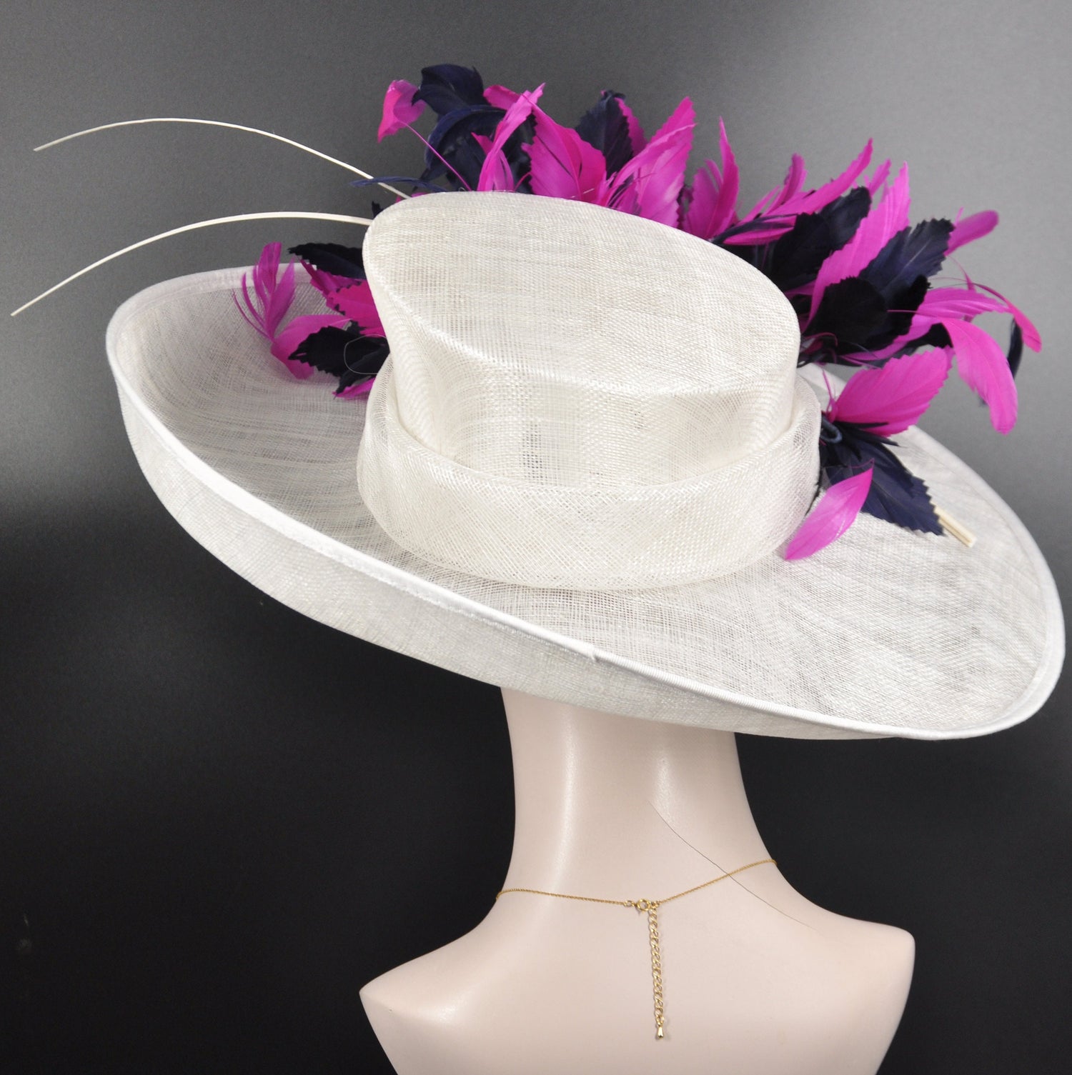 Wide Brim Sinamay Derby Hat: Hot Pink & Navy Feather Flower