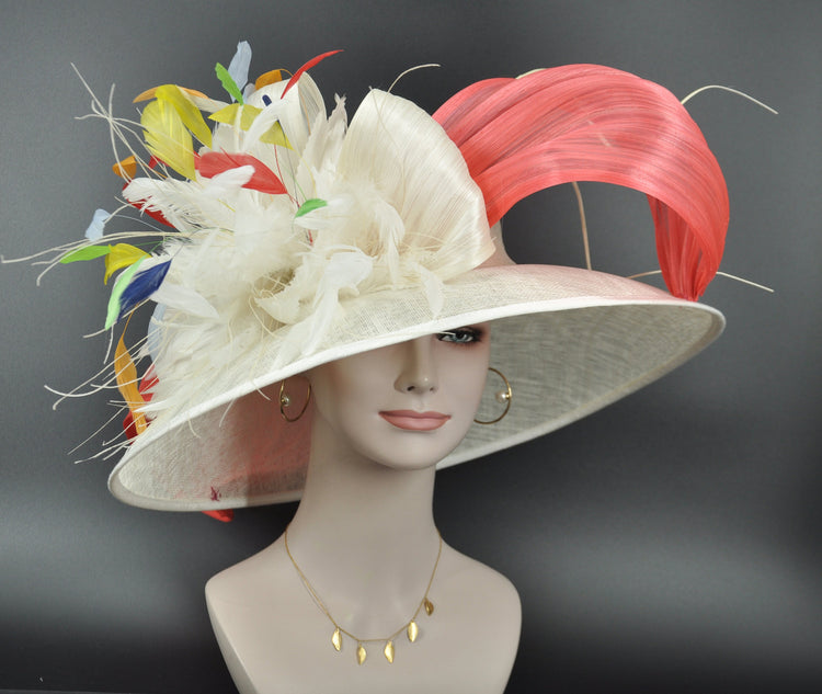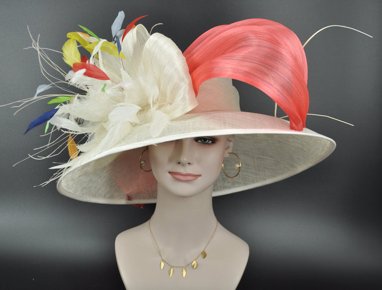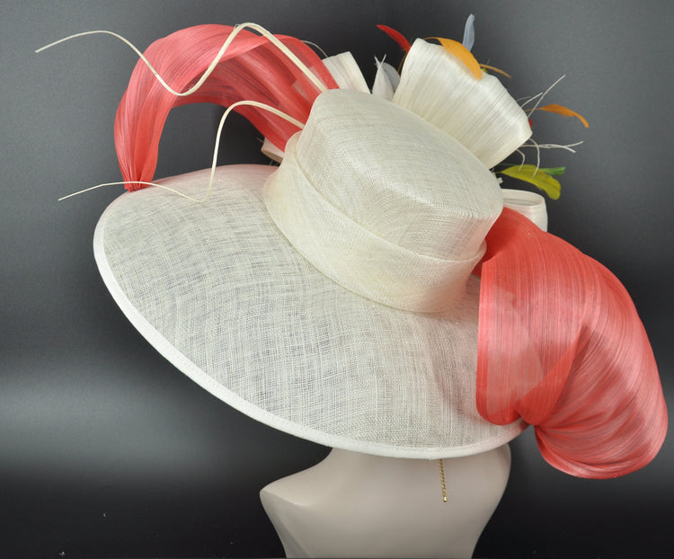 Wide Brim Sinamay Derby Hat: Ivory, Coral Silk Abaca Bows