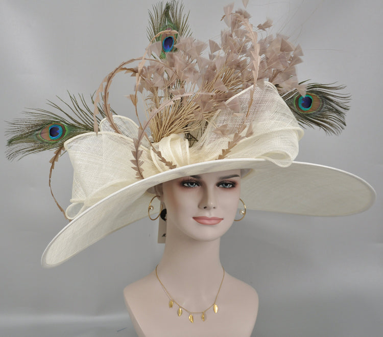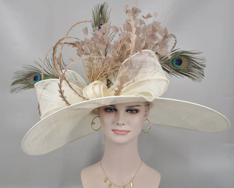 Wide Brim Sinamay Derby Hat: Ivory Feather Ascot Hat