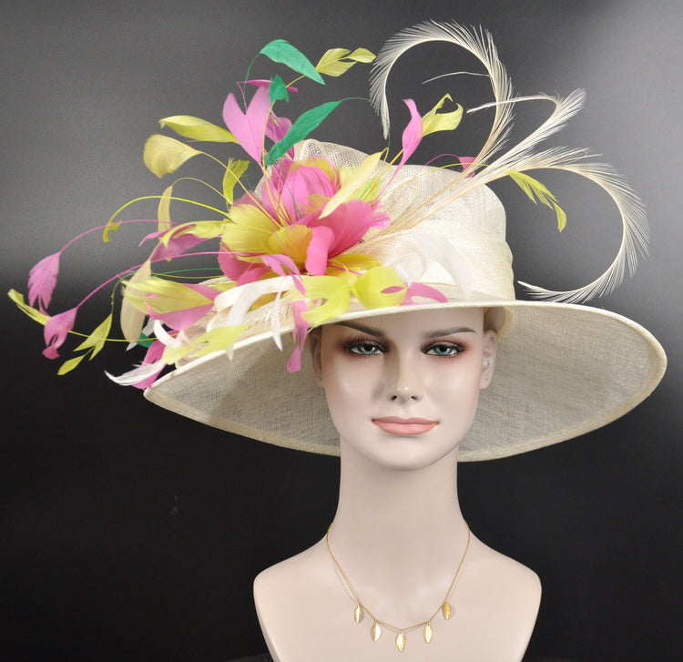 Wide Brim Sinamay Derby Hat: Ivory, Green, Pink Feather Fascinator