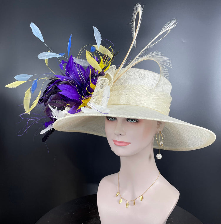 Wide Brim Sinamay Derby Hat: Ivory, Purple & Blue Feather Fascinator