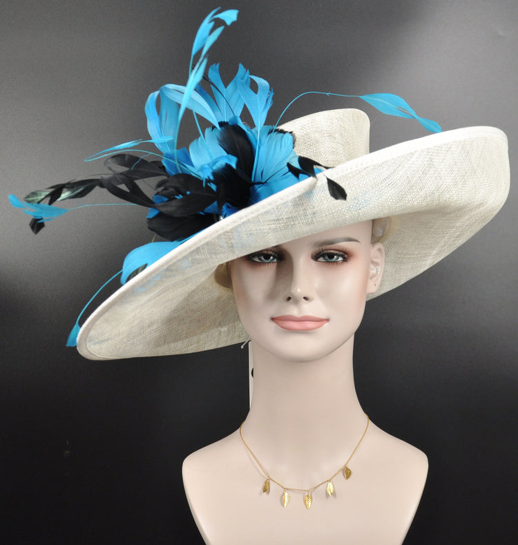 Wide Brim Sinamay Derby Hat: Ivory, Teal & Black Feather Accent