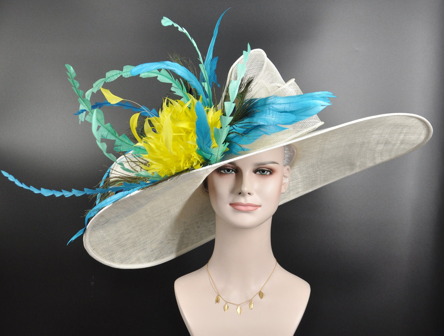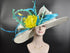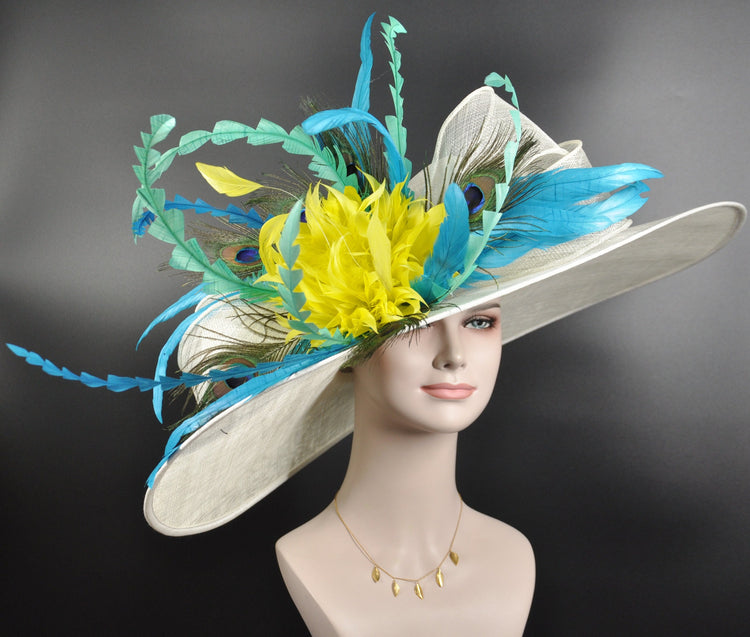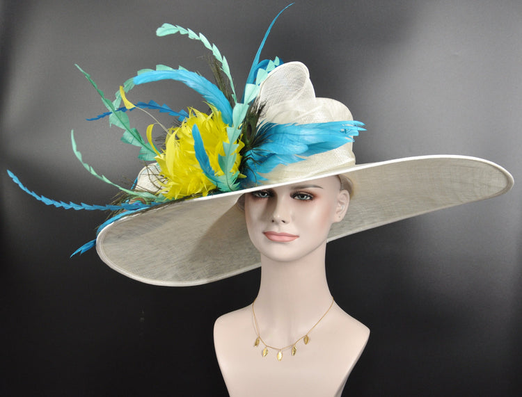 Wide Brim Sinamay Derby Hat: Ivory, Teal, Feather Ascot Hat