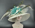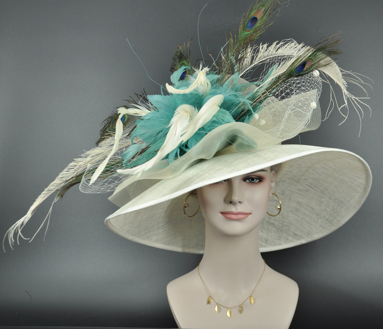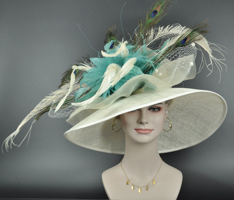 Wide Brim Sinamay Derby Hat: Ivory, Turquoise Feather & Peacock