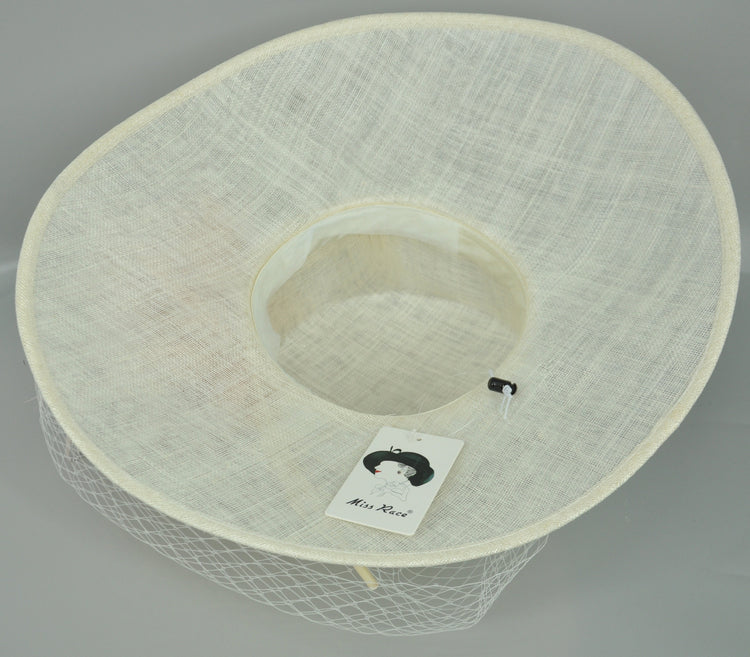 Wide Brim Sinamay Derby Hat: Ivory with Baby Pink Feathers