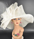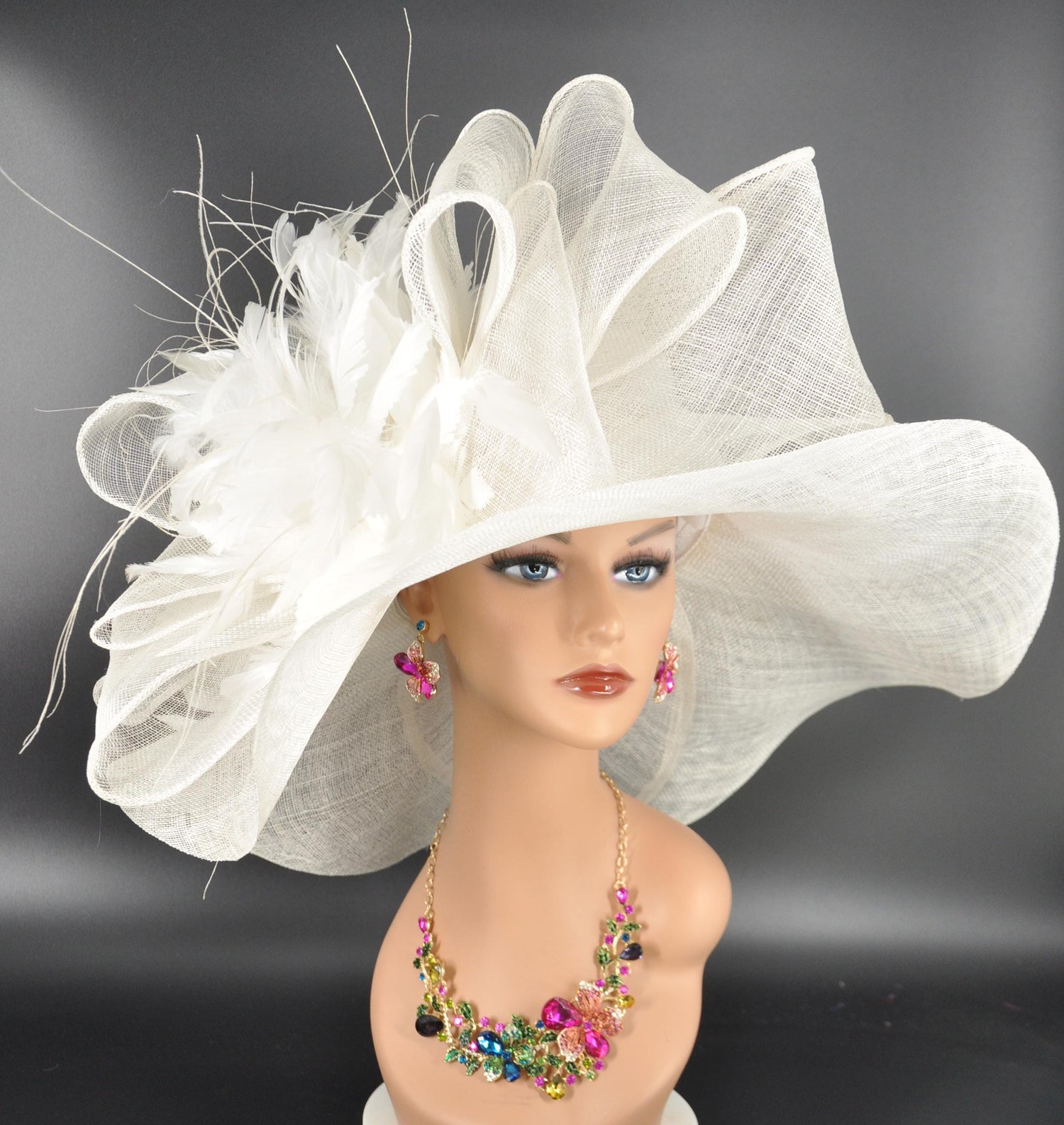This beautiful sinamay hat is an elegant wear at any church or derby event. its sinamay material is not too intimidating and attracts the eye. The chic flower adnorment that rests on the wide, side sweep brim is complemented by sinamay accentuations.