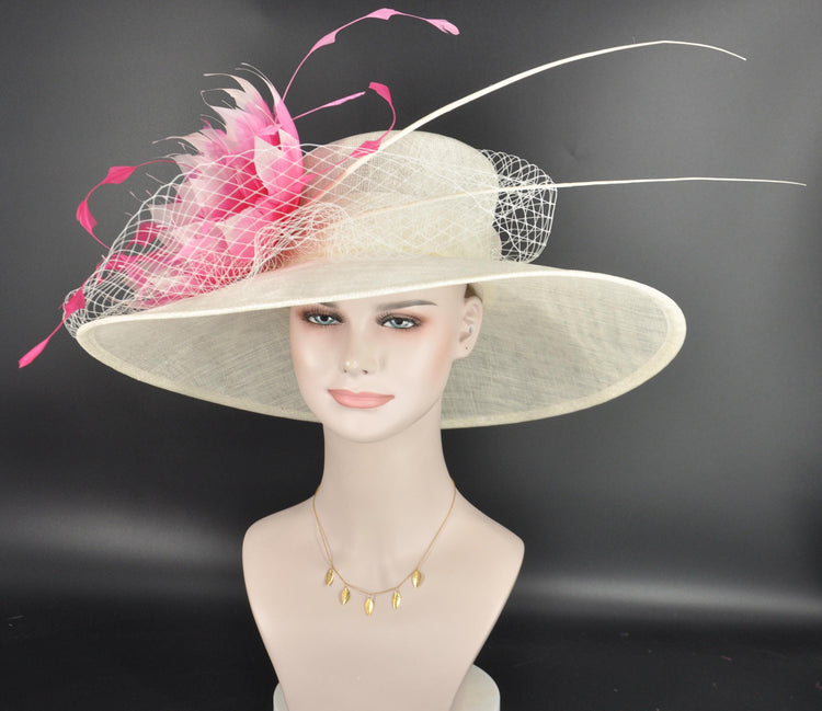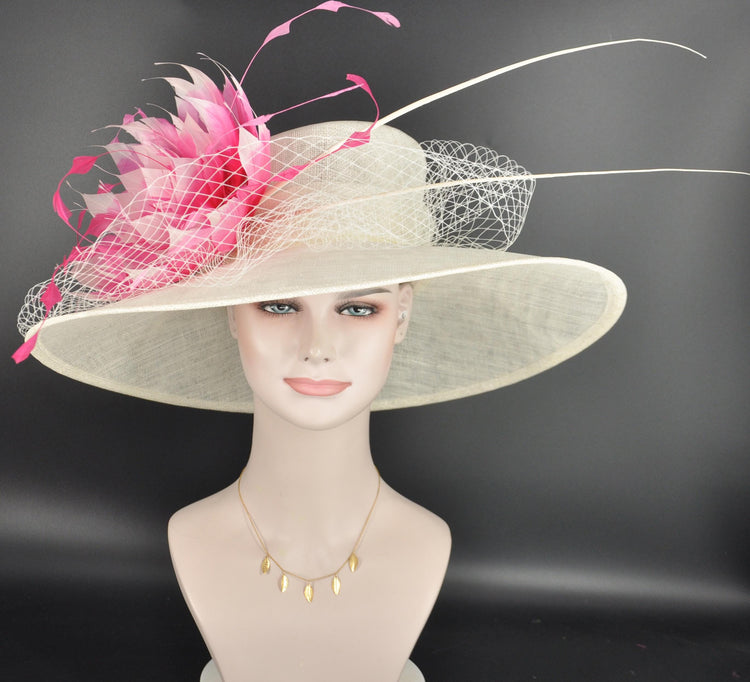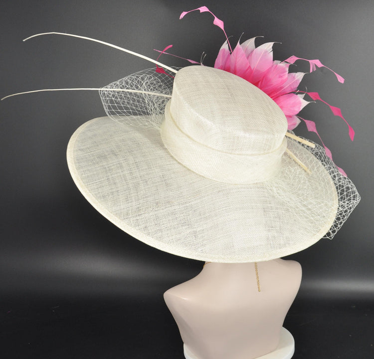 Wide Brim Sinamay Derby Hat: Off White & Pink Feather Flower