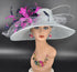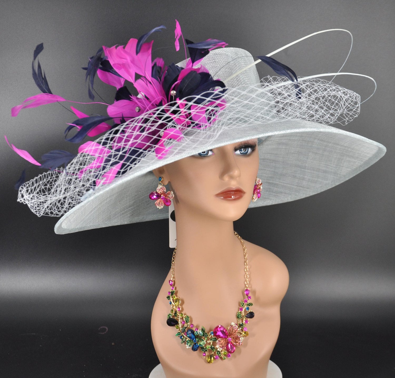 Wide Brim Sinamay Derby Hat: Powder Blue, Navy, Fuchsia Feather Flower