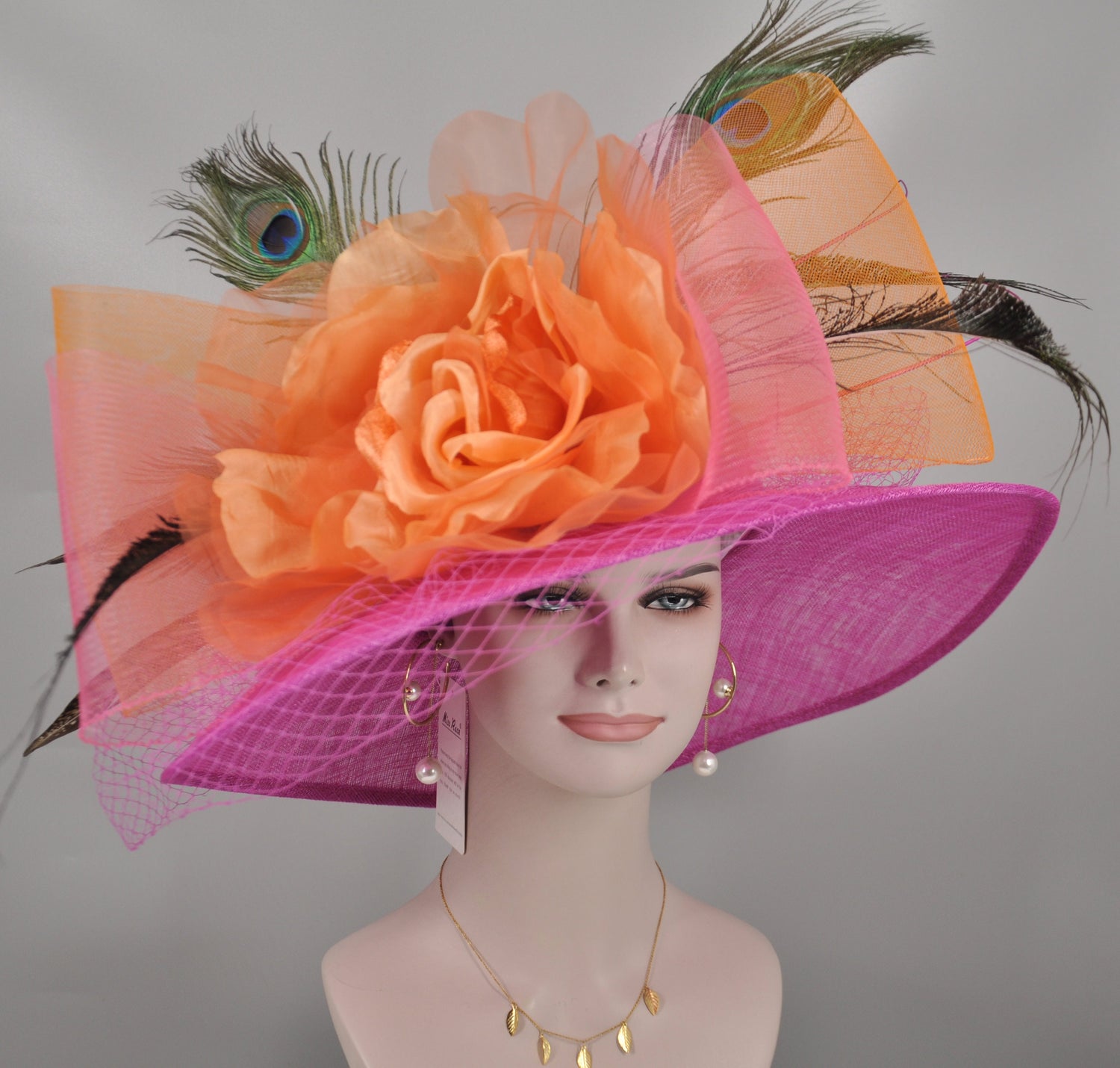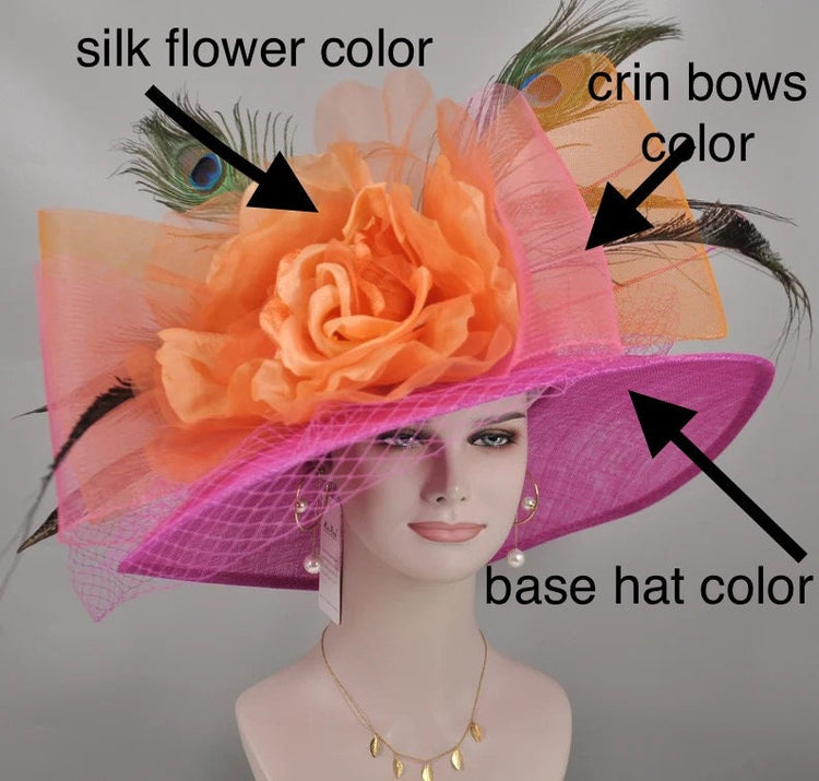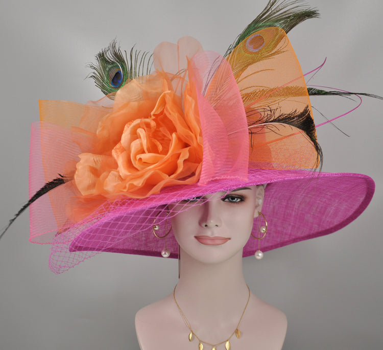 Wide Brim Sinamay Derby Hat: Silk Flower, Peacock & Pheasant Feathers