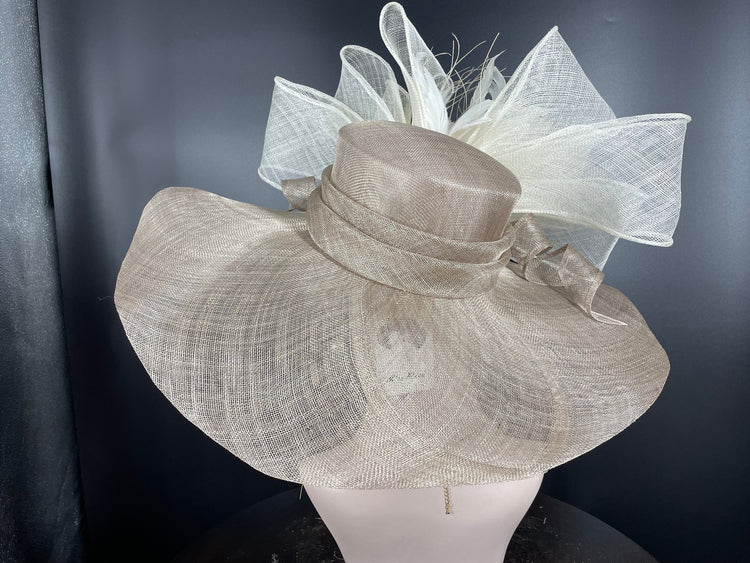 Wide Brim Sinamay Derby Hat: Taupe & Ivory Feather Church Hat