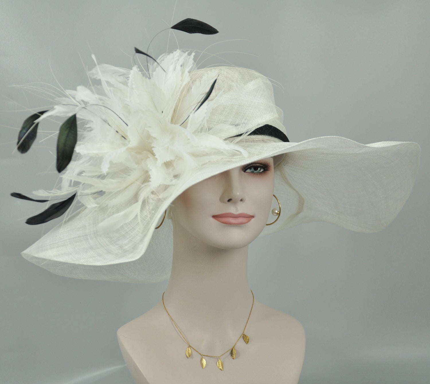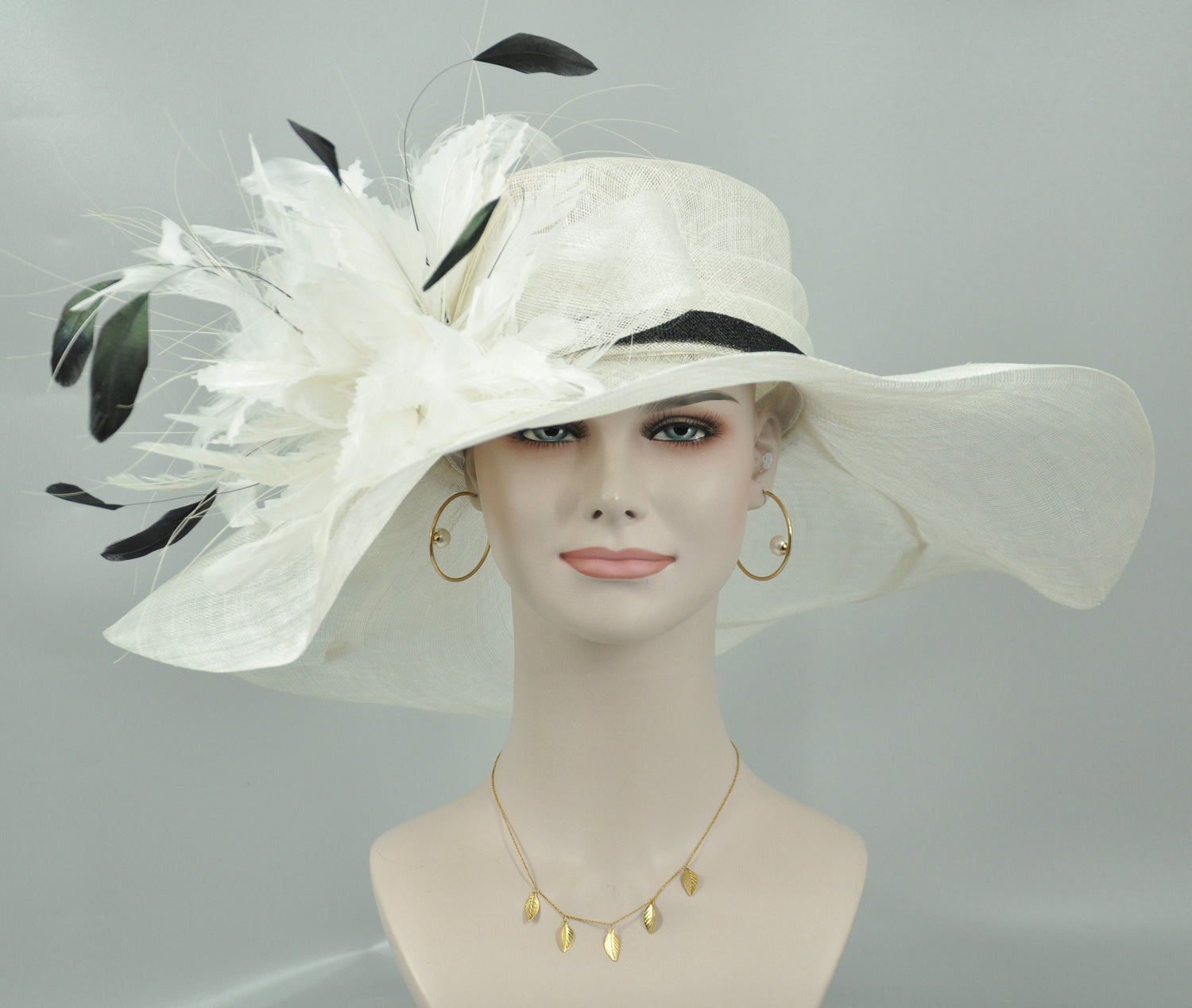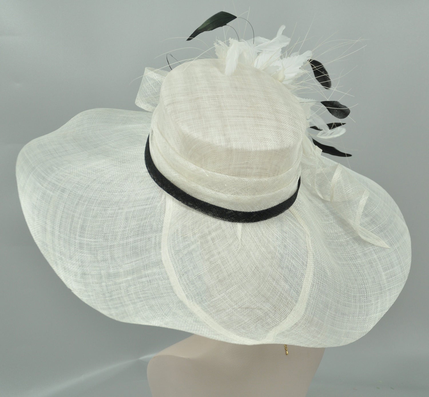 Wide Brim Sinamay Derby Hat: White Feather Flower Church Hat