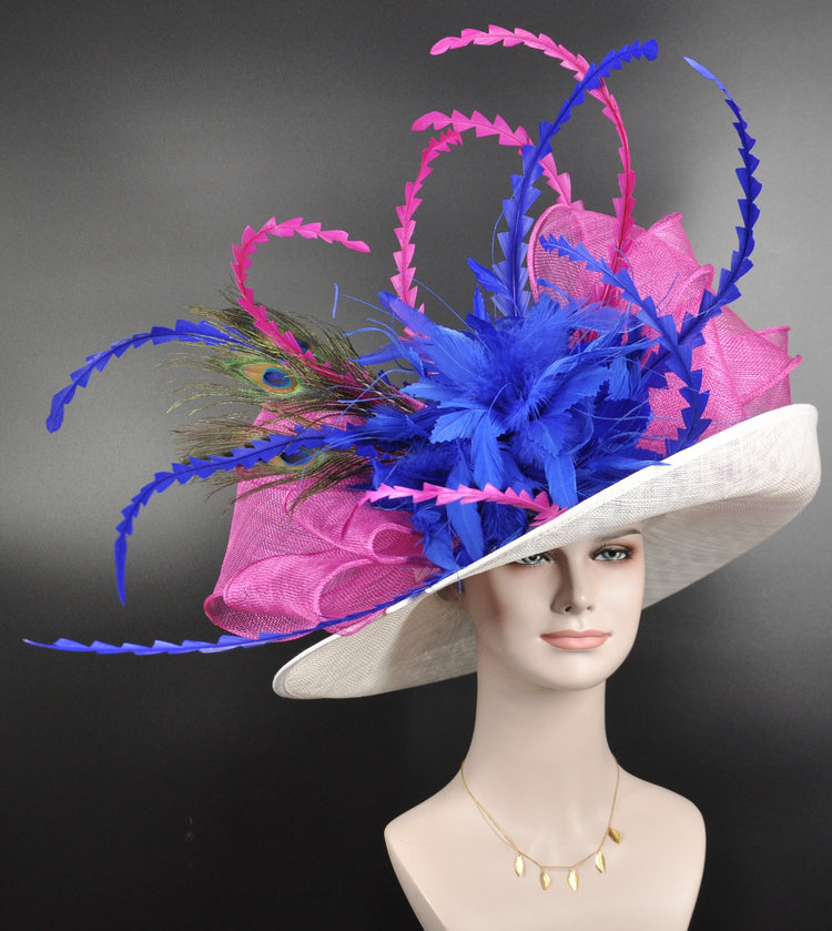 Wide Brim Sinamay Derby Hat: White, Fuchsia, Royal Blue