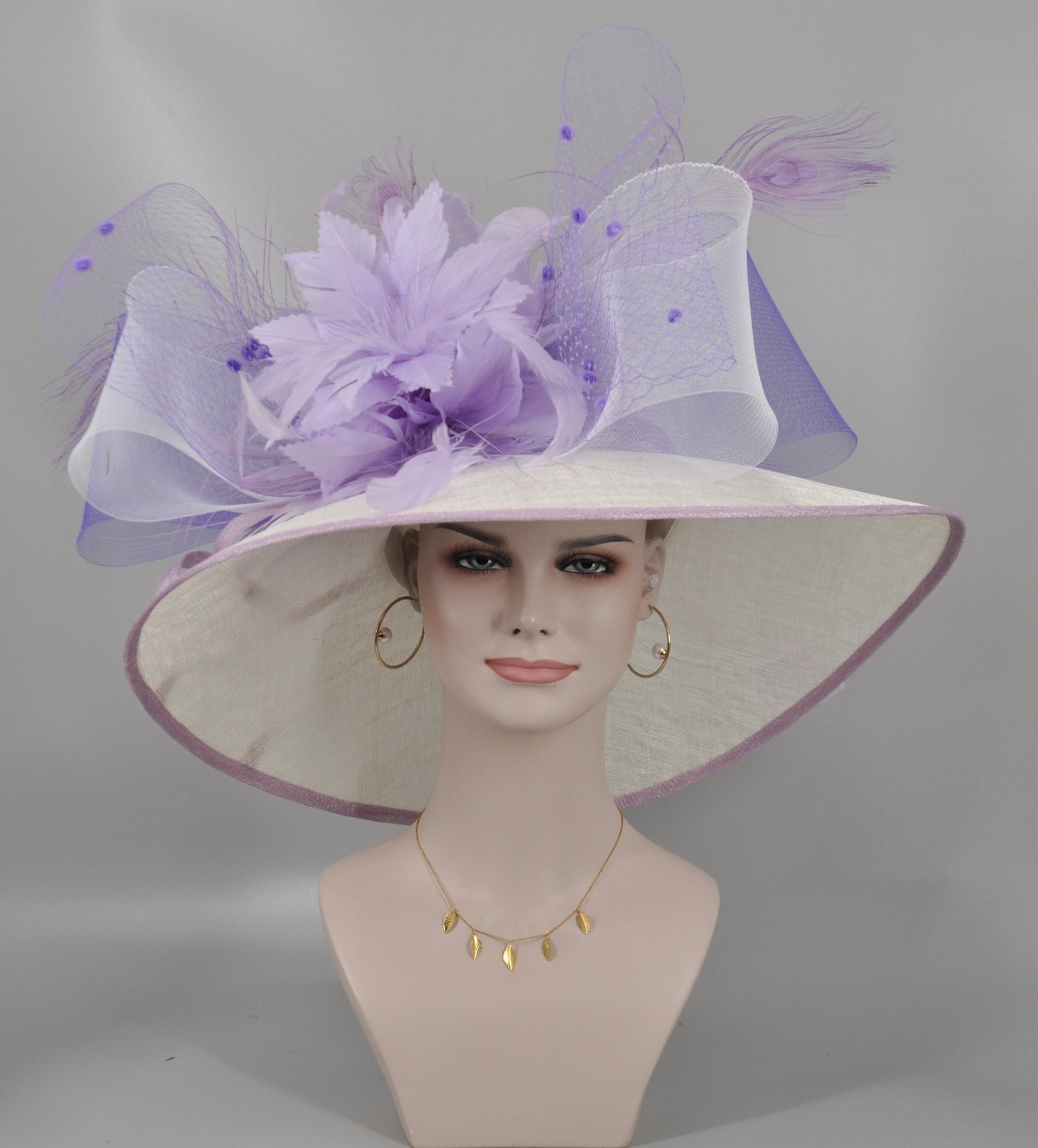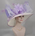Wide Brim Sinamay Derby Hat: White & Lavender Feathered Church Hat