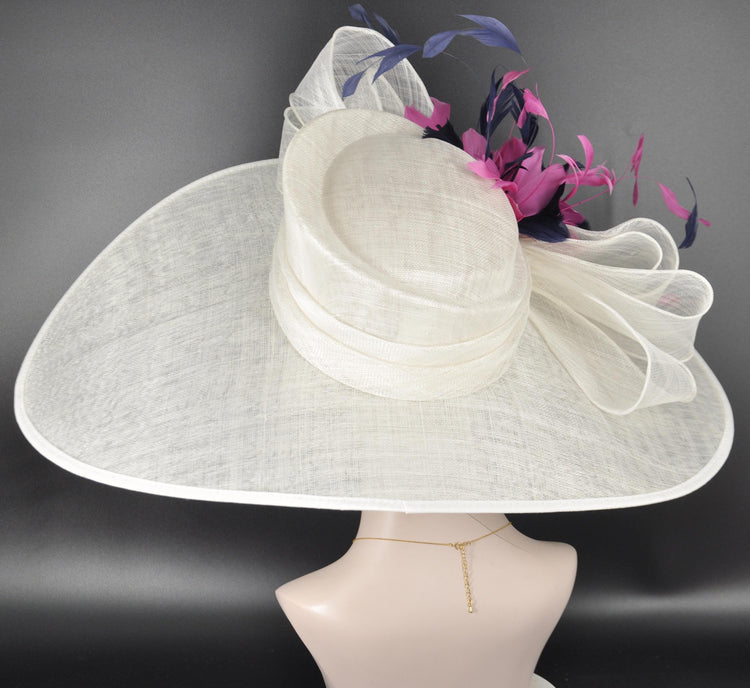 Wide Brim Sinamay Derby Hat: White, Navy & Hot Pink Flower