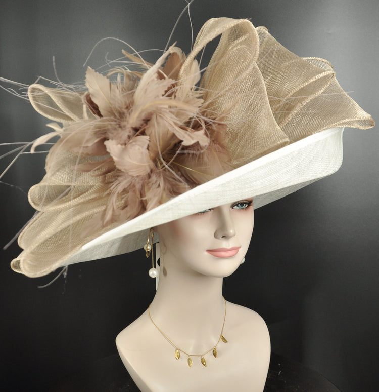 Wide Brim Sinamay Derby Hat: White & Taupe Feather Church Hat